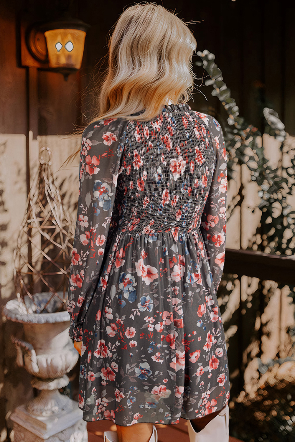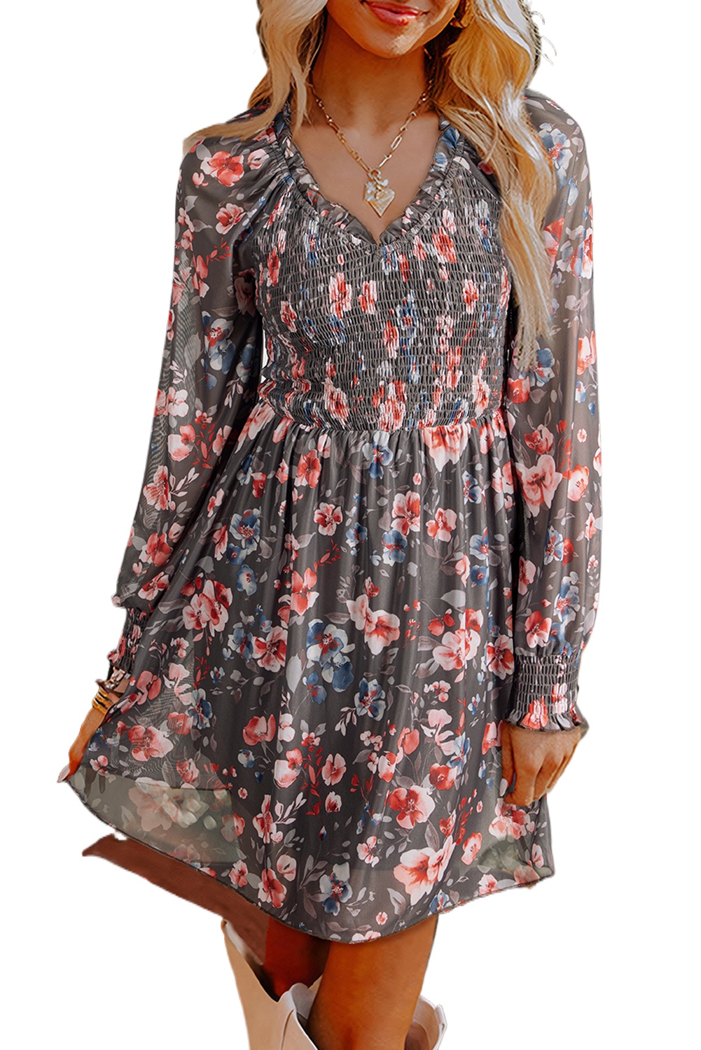 1. Feminine Floral Design: The Brown Frilly Smocked Bodice Floral Mesh Long Sleeve Mini Dress features a beautiful floral pattern that adds a touch of elegance and charm, perfect for any casual daily occasion.