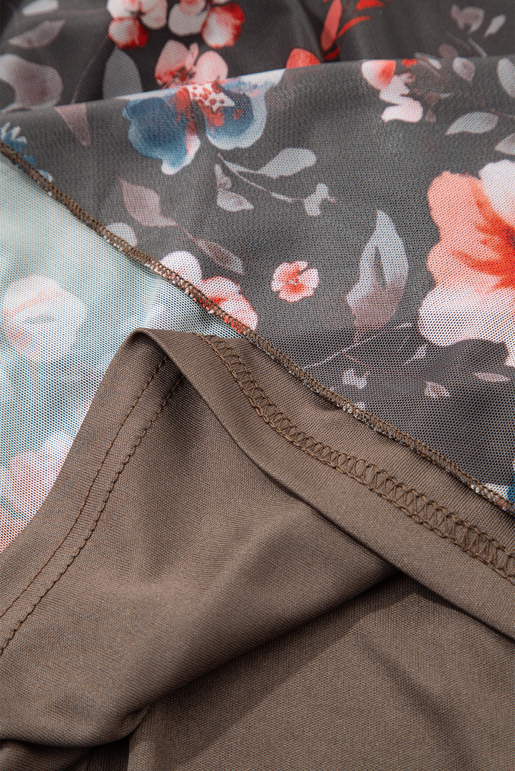 Women’s Brown Frilly Smocked Bodice Floral Mesh Long Sleeve Mini Dress