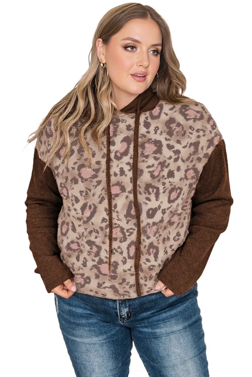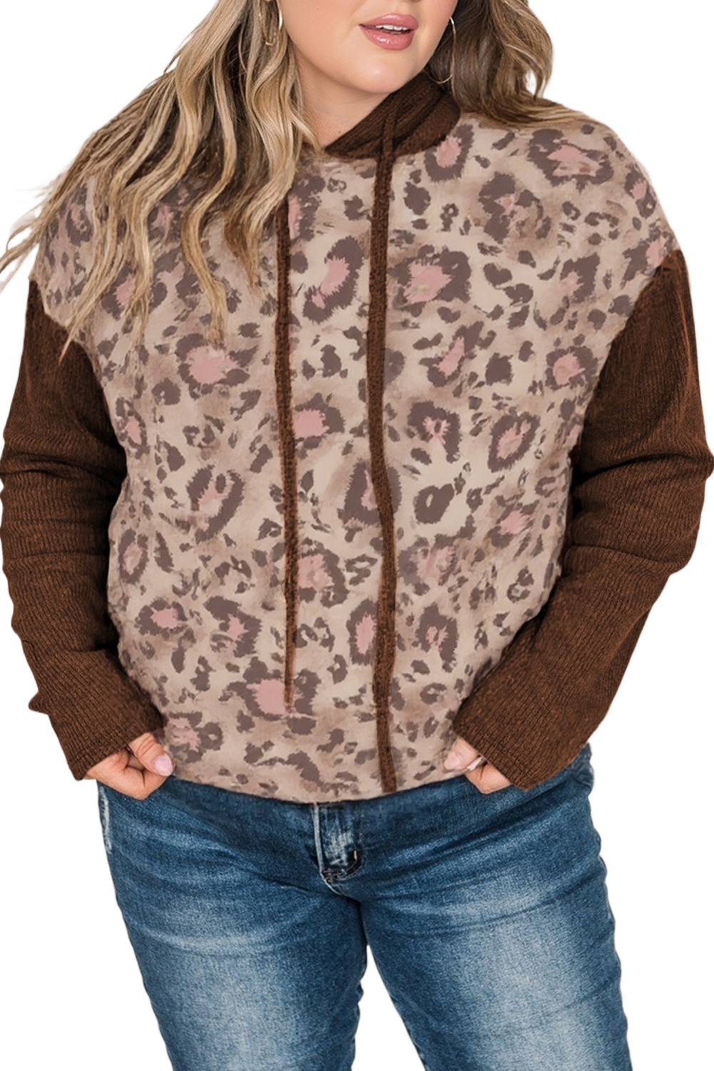 Women’s Brown Leopard Print Knit Patchwork Hoodie – Casual Fall Essential for Daily Wear
