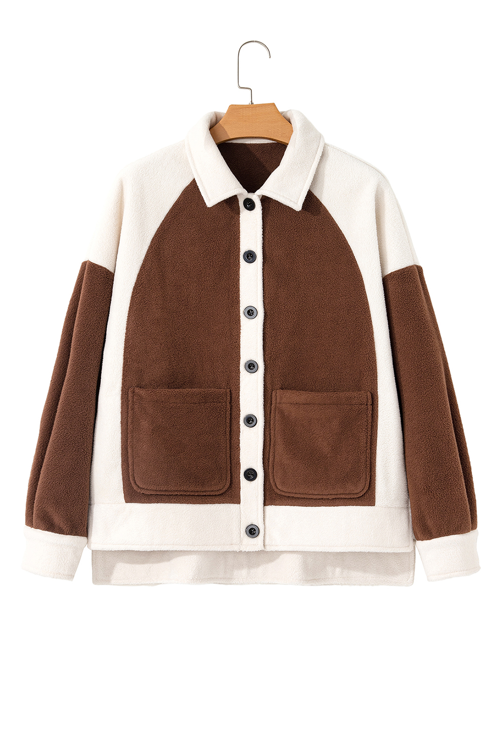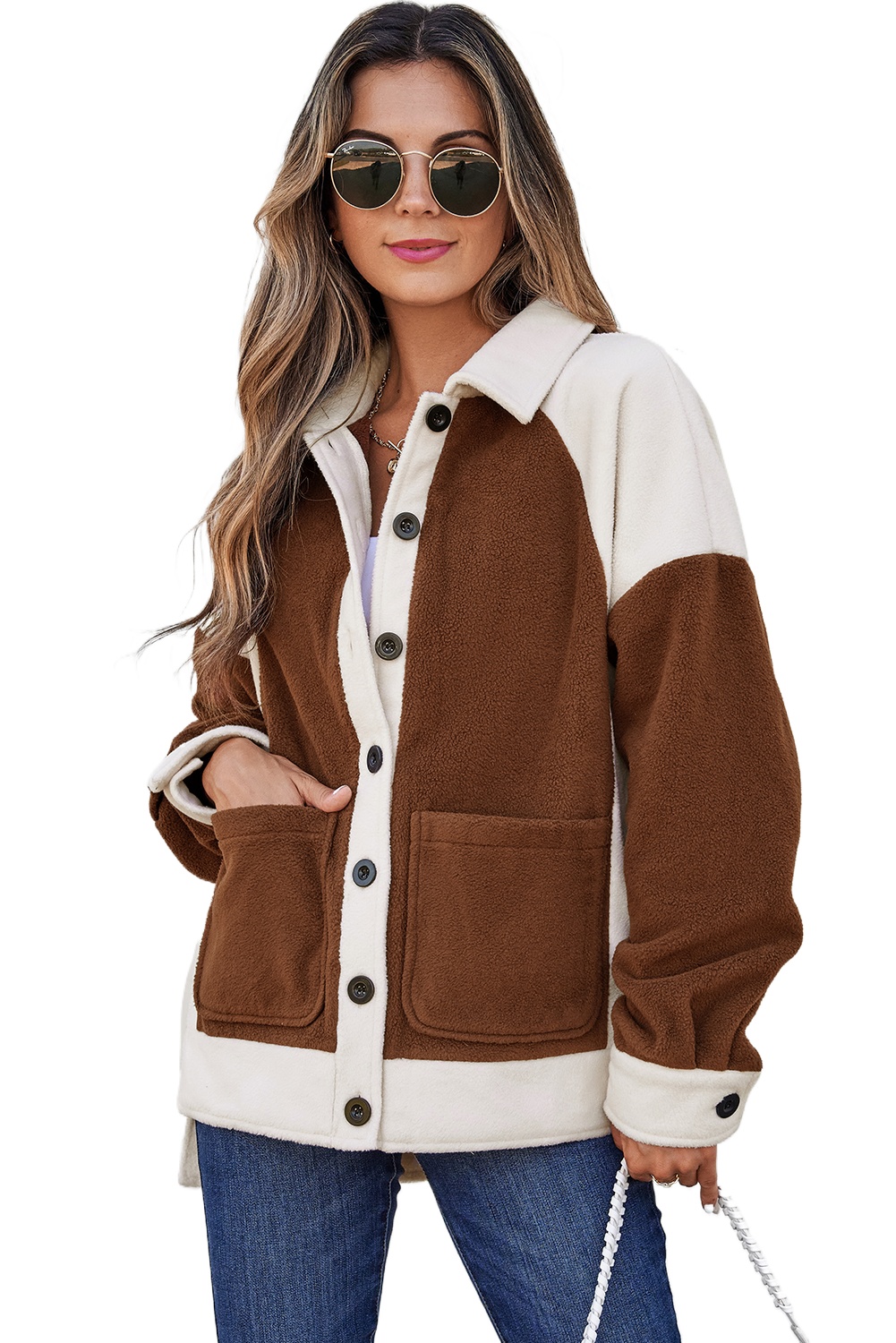 Women’s Brown Patchwork Fleece Shacket for Daily Casual Wear