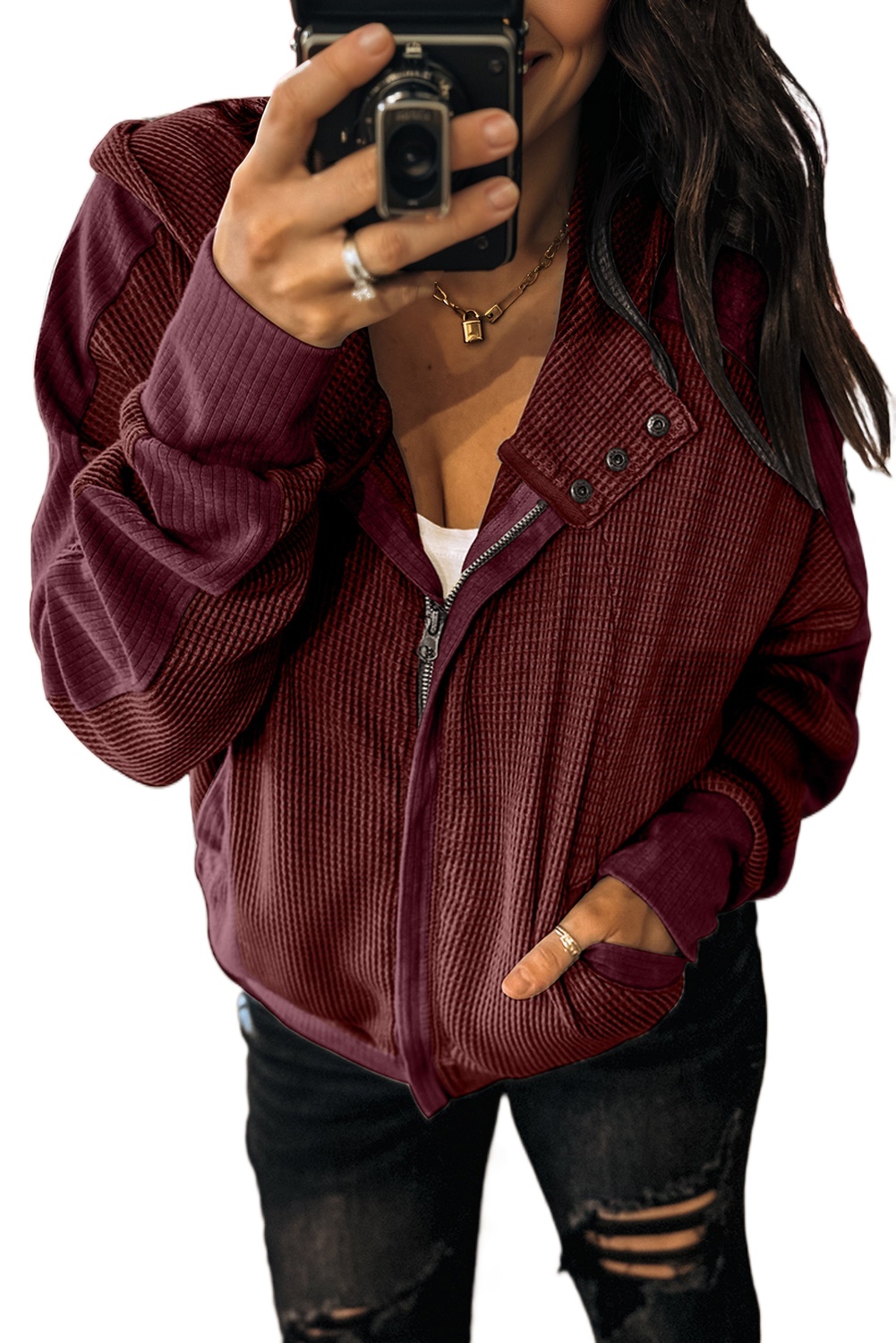 Women’s Burgundy Waffle Knit Hooded Jacket – Casual Zip-Up with Button Front for Fall & Autumn