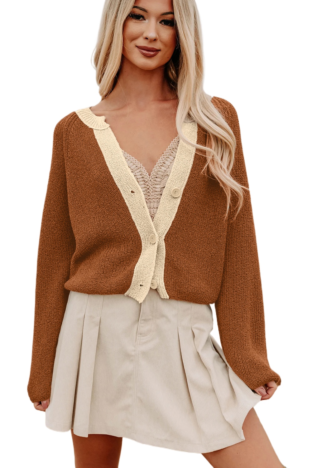 Women’s Chestnut Color Block V-Neck Long Sleeve Cardigan – Casual Daily Layering for Fall Days