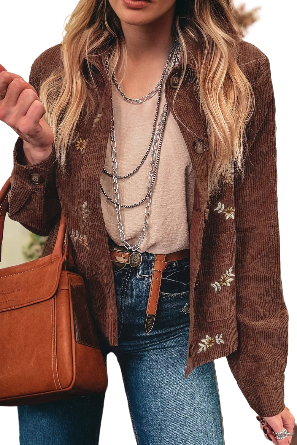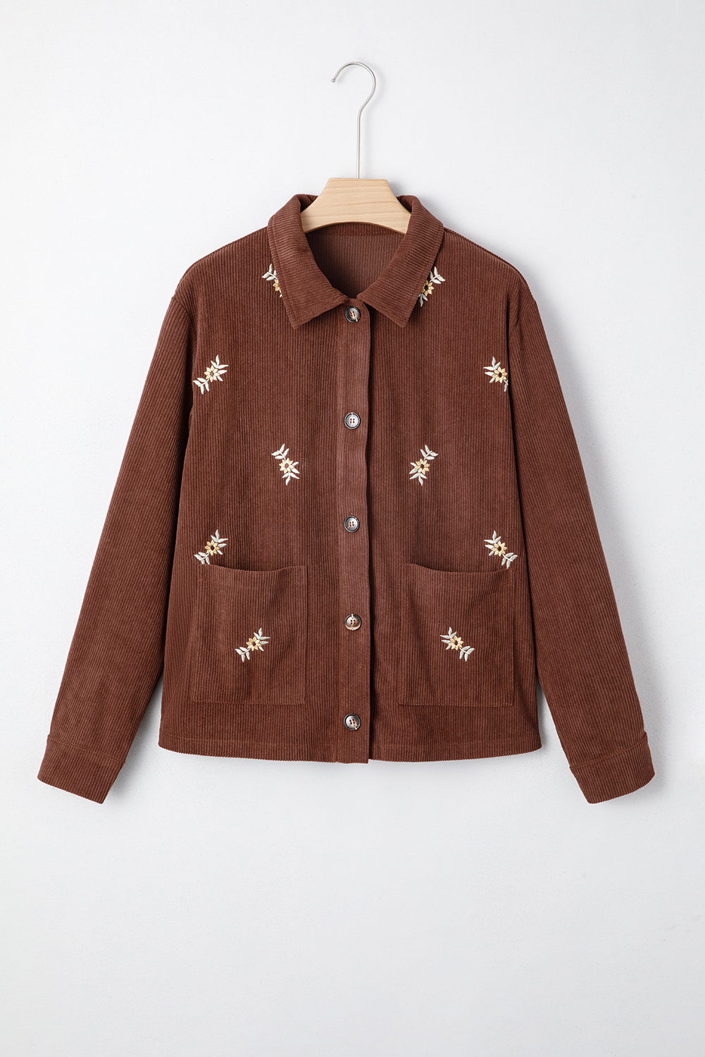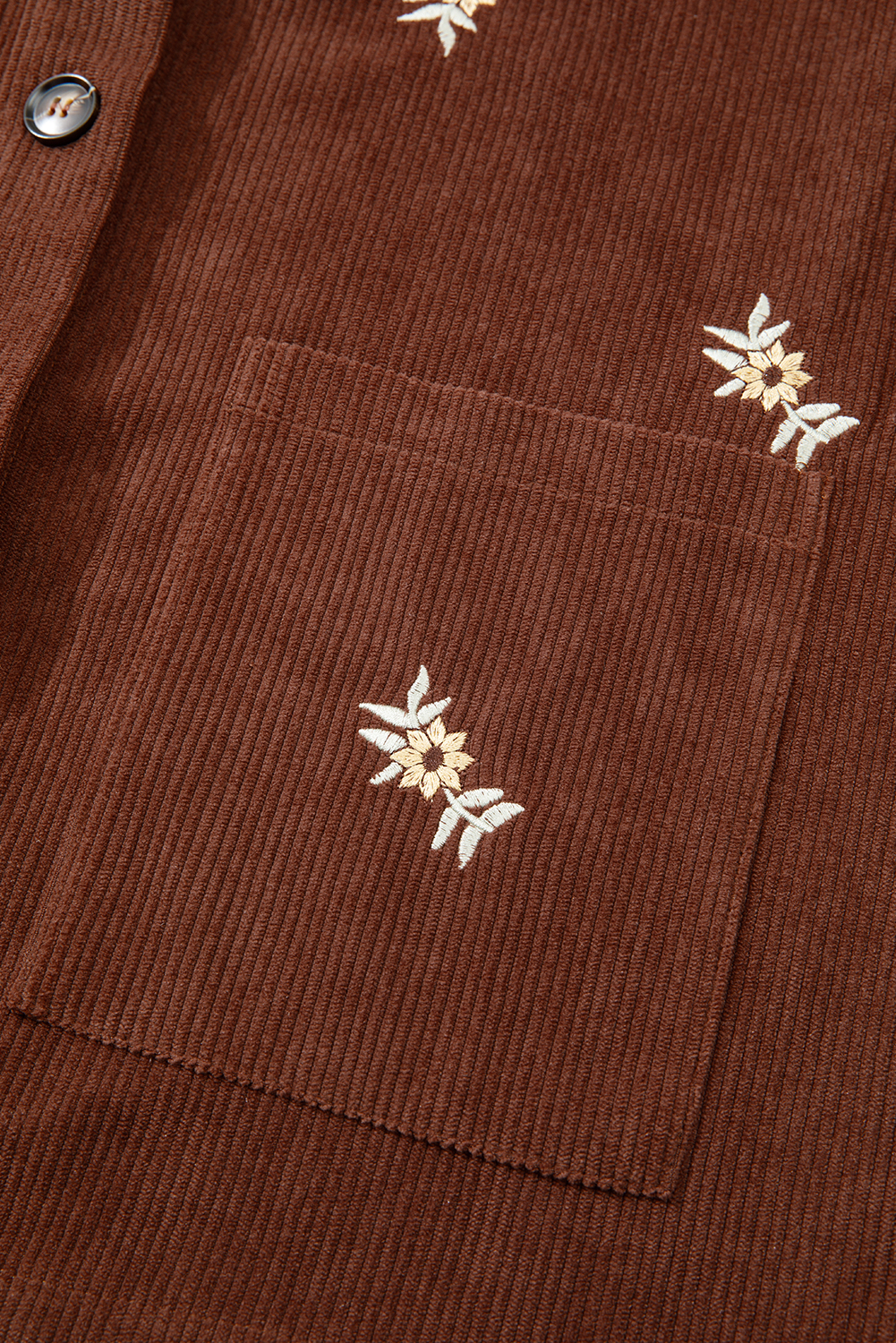 Women’s Coffee Floral Embroidered Corduroy Jacket – Stylish Button Front with Pocket for Daily Wear