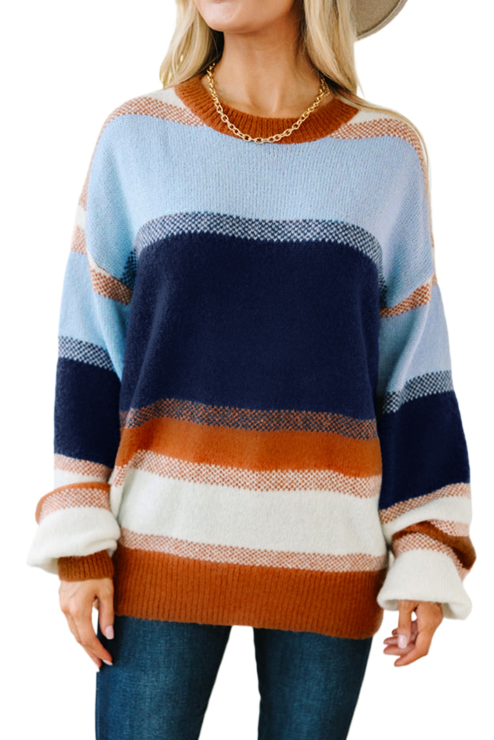 Women’s Dark Blue Color Block Round Neck Tunic Sweater for Casual Fall Style