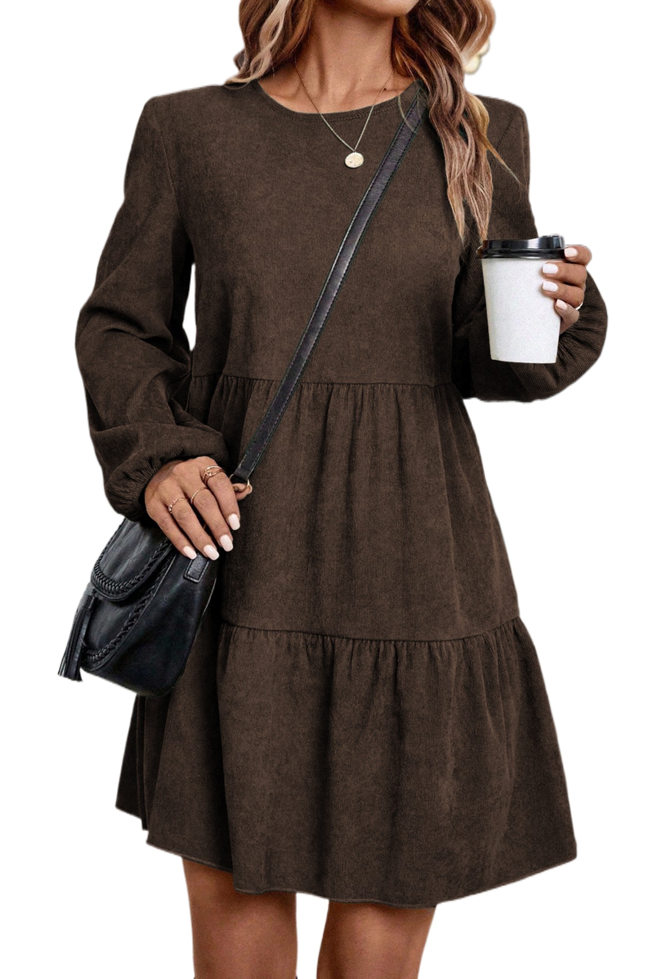 Women’s Dark Brown Lantern Sleeve Mini Dress – Casual Autumn A-Line Dress for Daily Wear