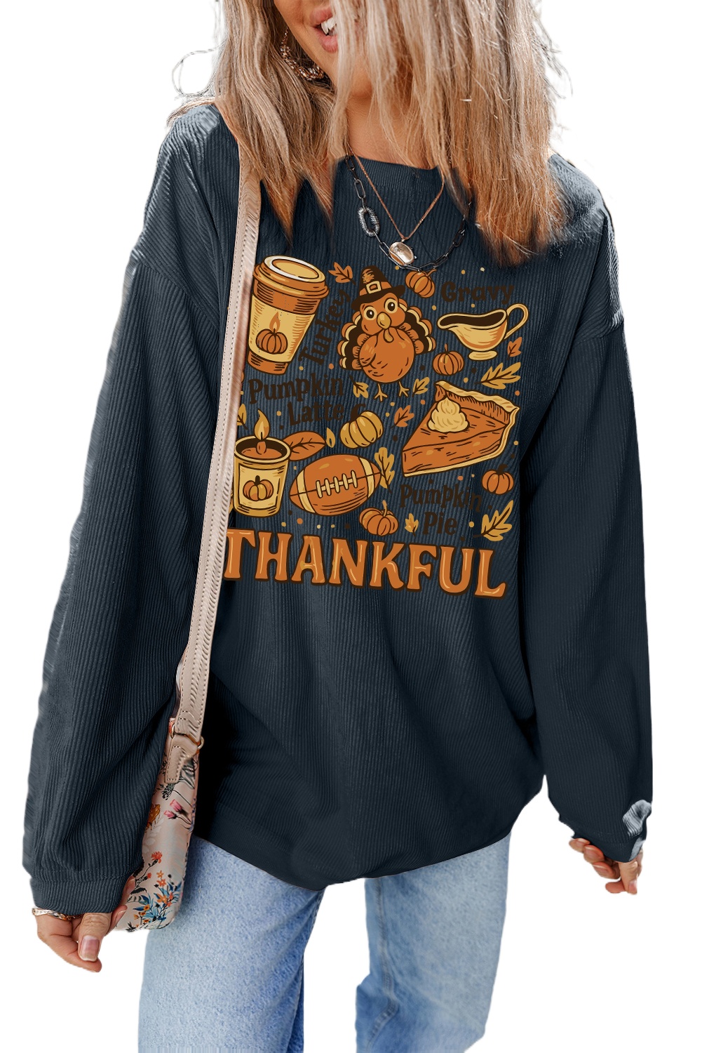 Women’s Dark Grey Ribbed Baggy Sweatshirt with THANKFUL Print – Casual Thanksgiving Layering for Daily Wear