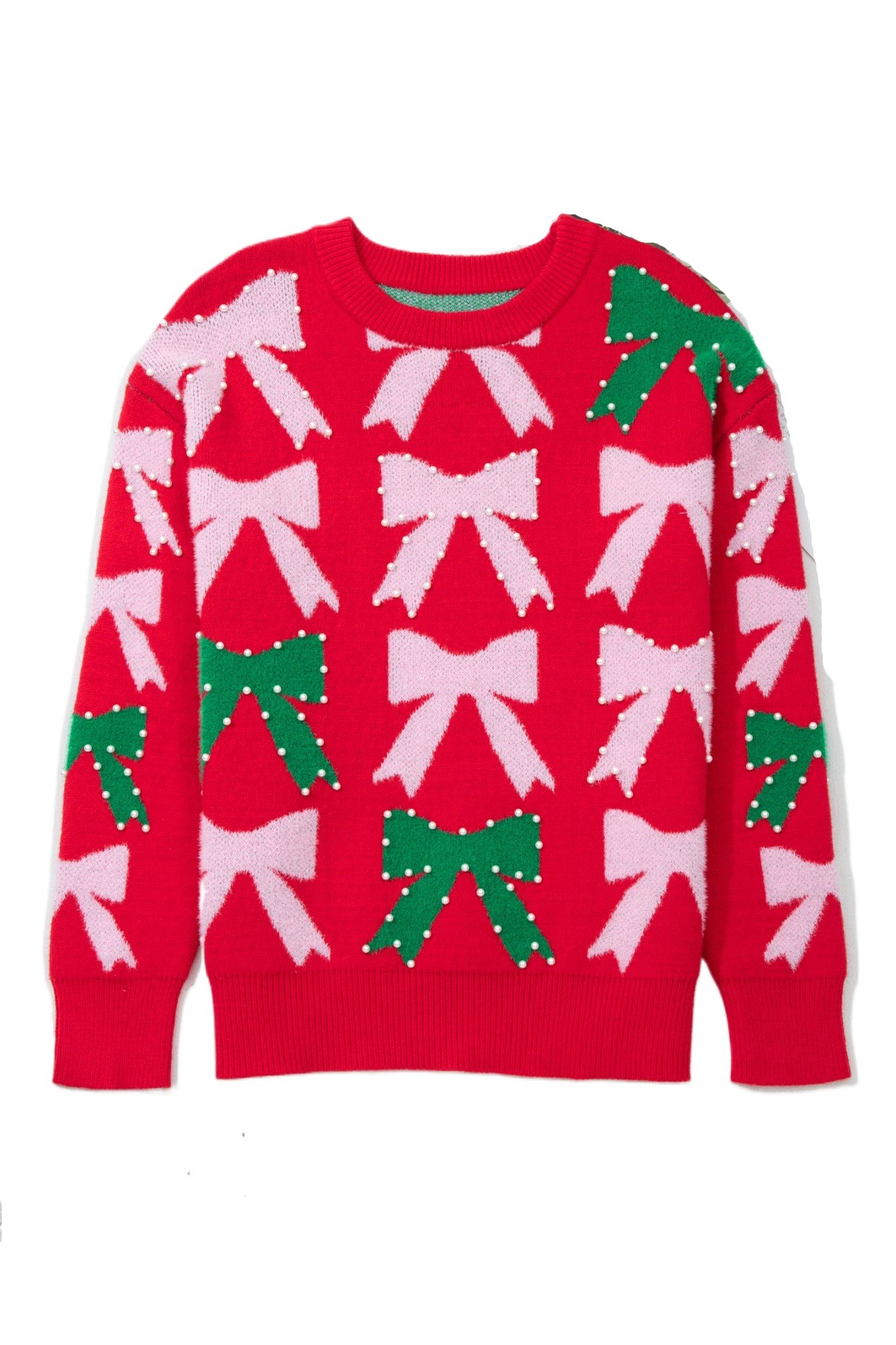 Women’s Fiery Red Bow Pearl Embellished Christmas Sweater – Festive Casual Style