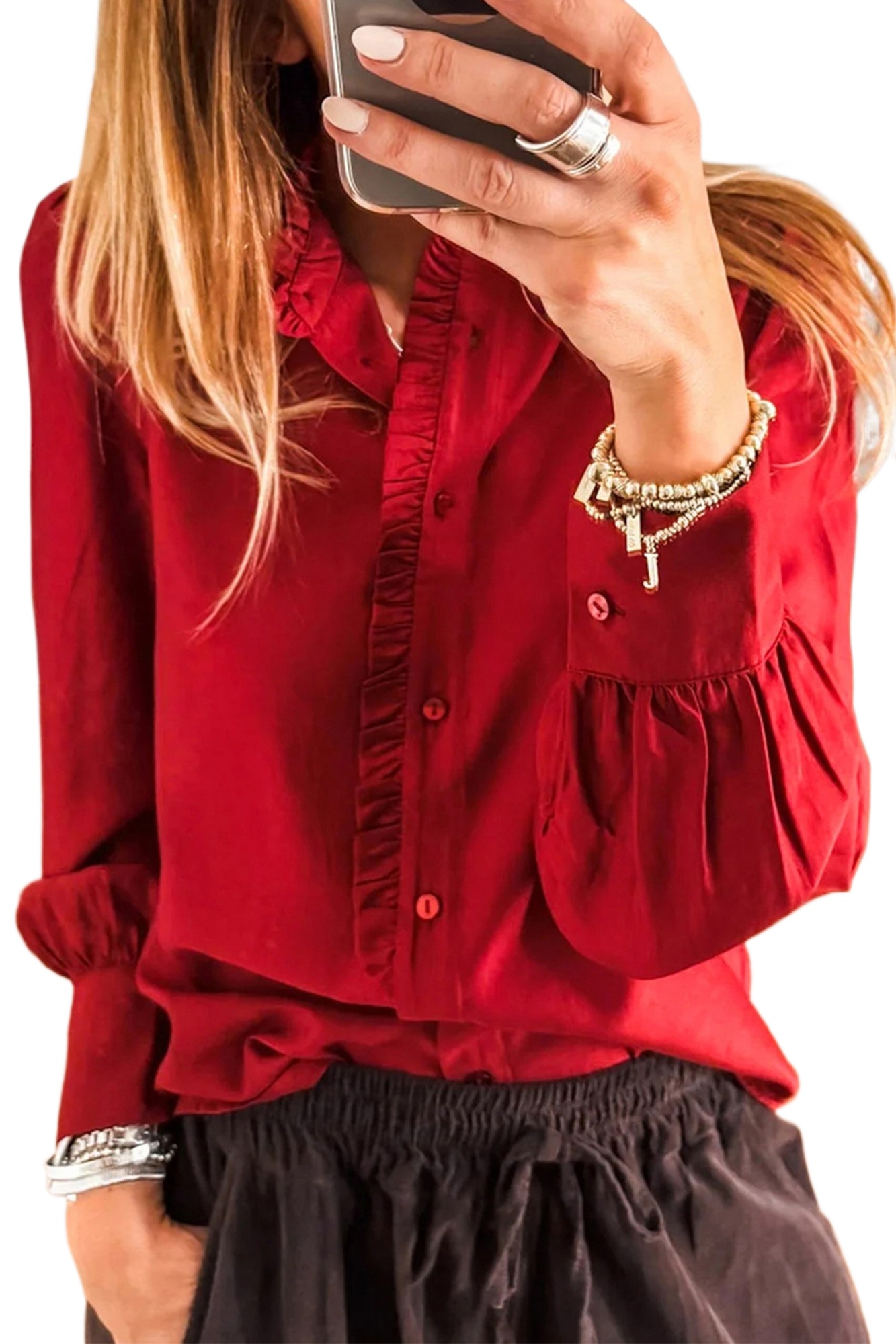 Women’s Fiery Red Frilled Trim Long Sleeve Shirt – Casual Pleated Button-Up for Daily Wear