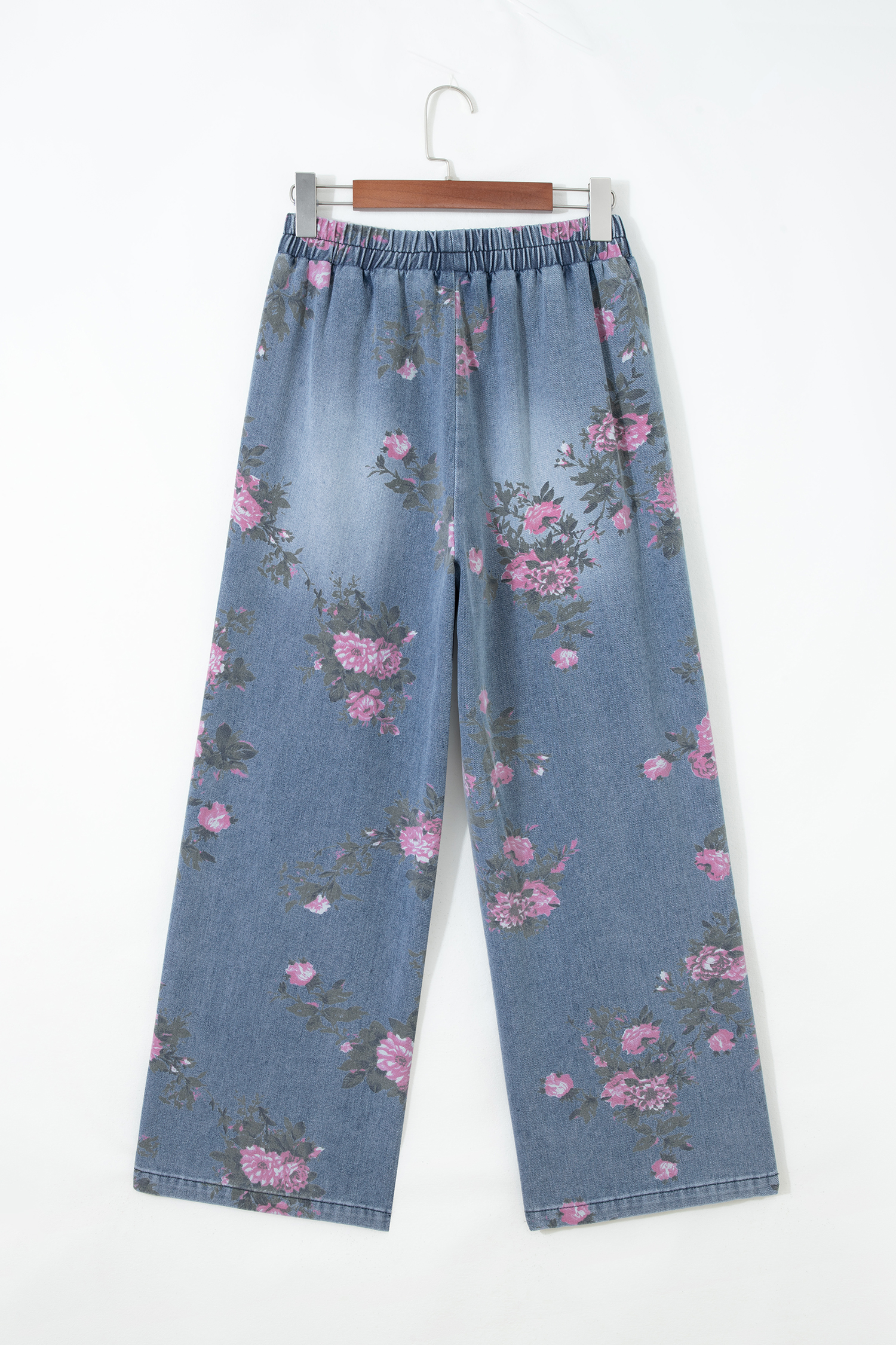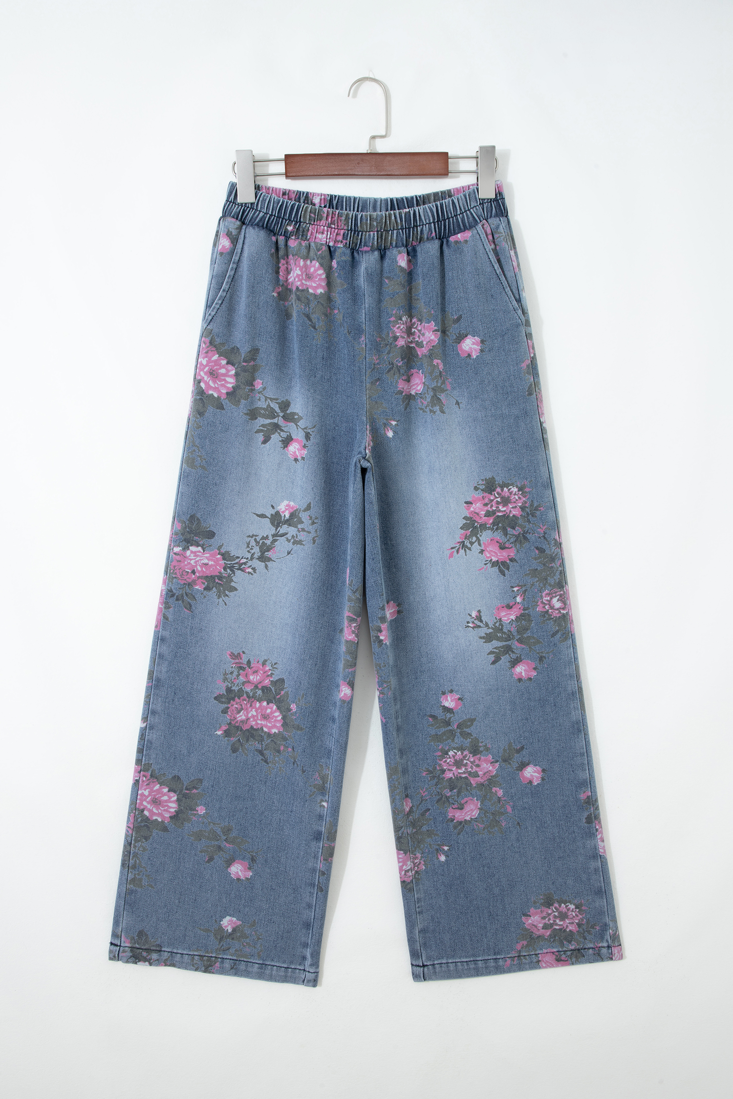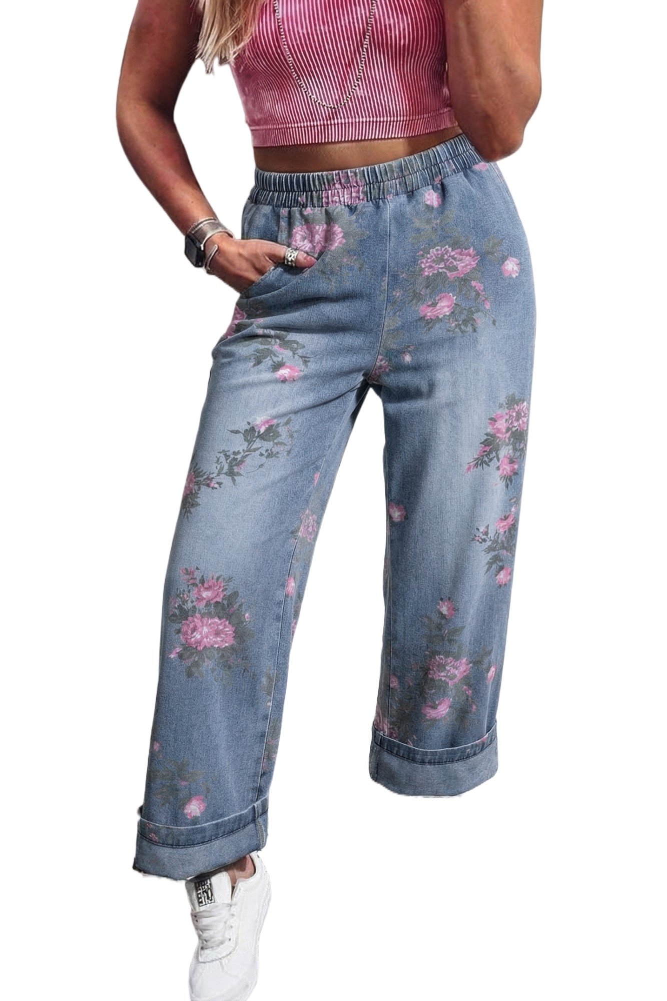 Women’s Floral Print High Waist Jeans – Elastic Waist Pull On Denim Pants for Casual Daily Wear