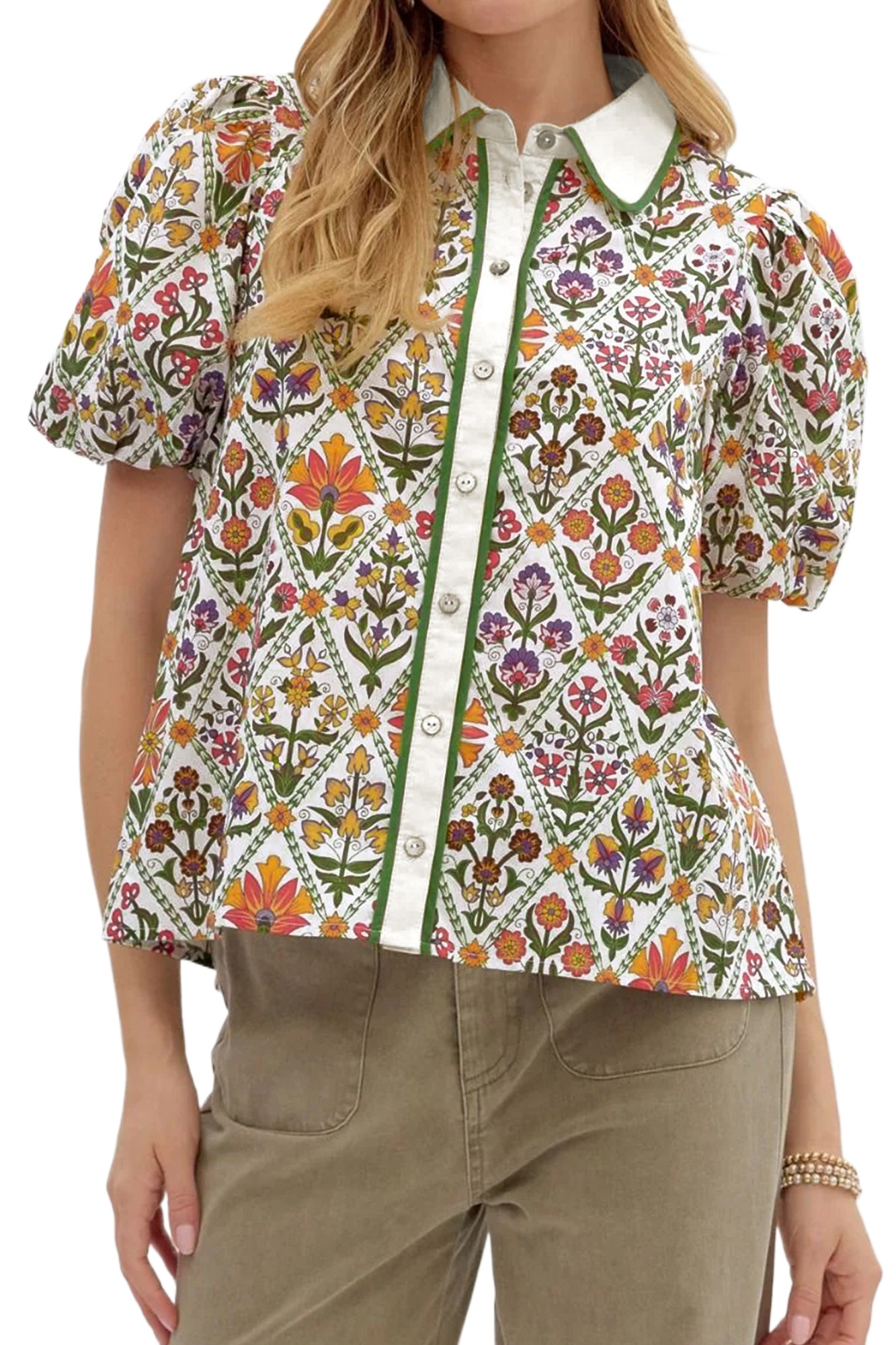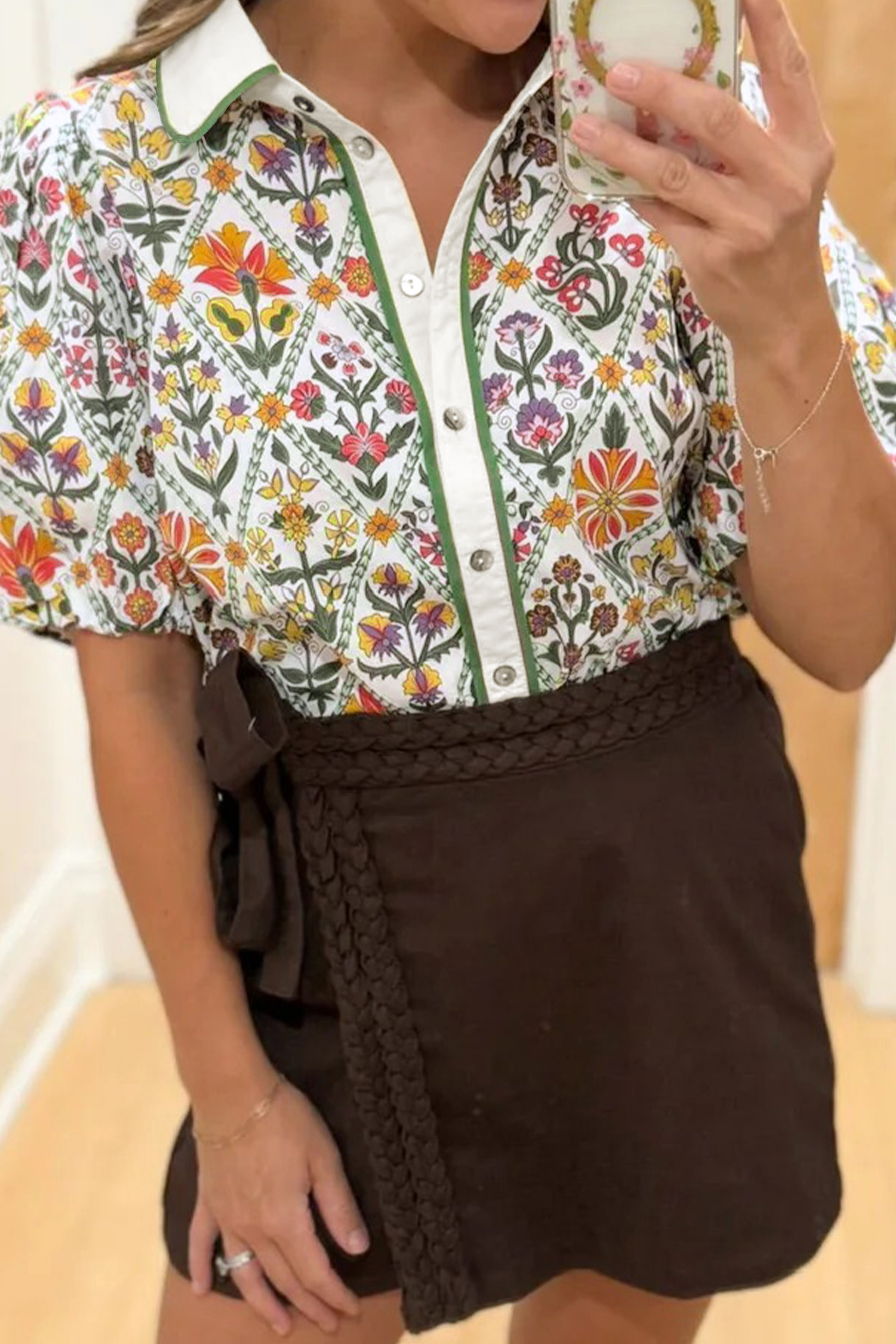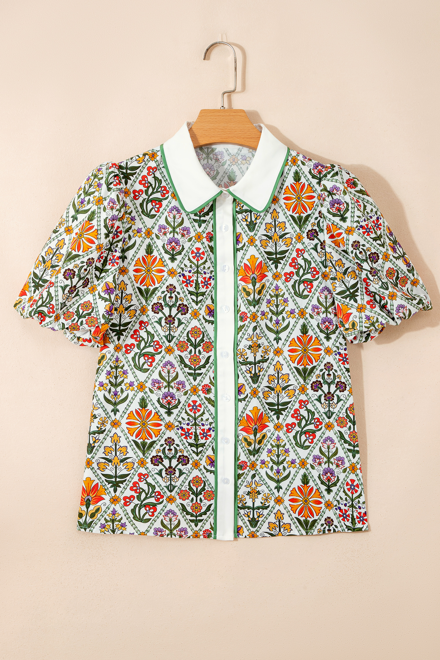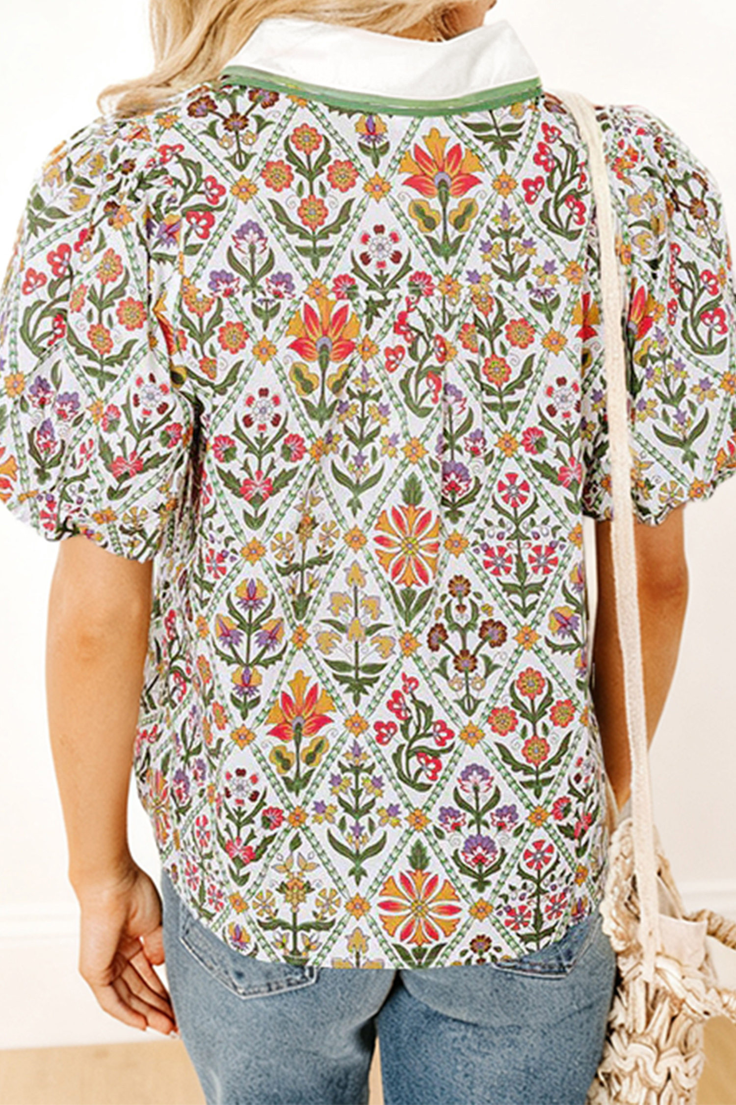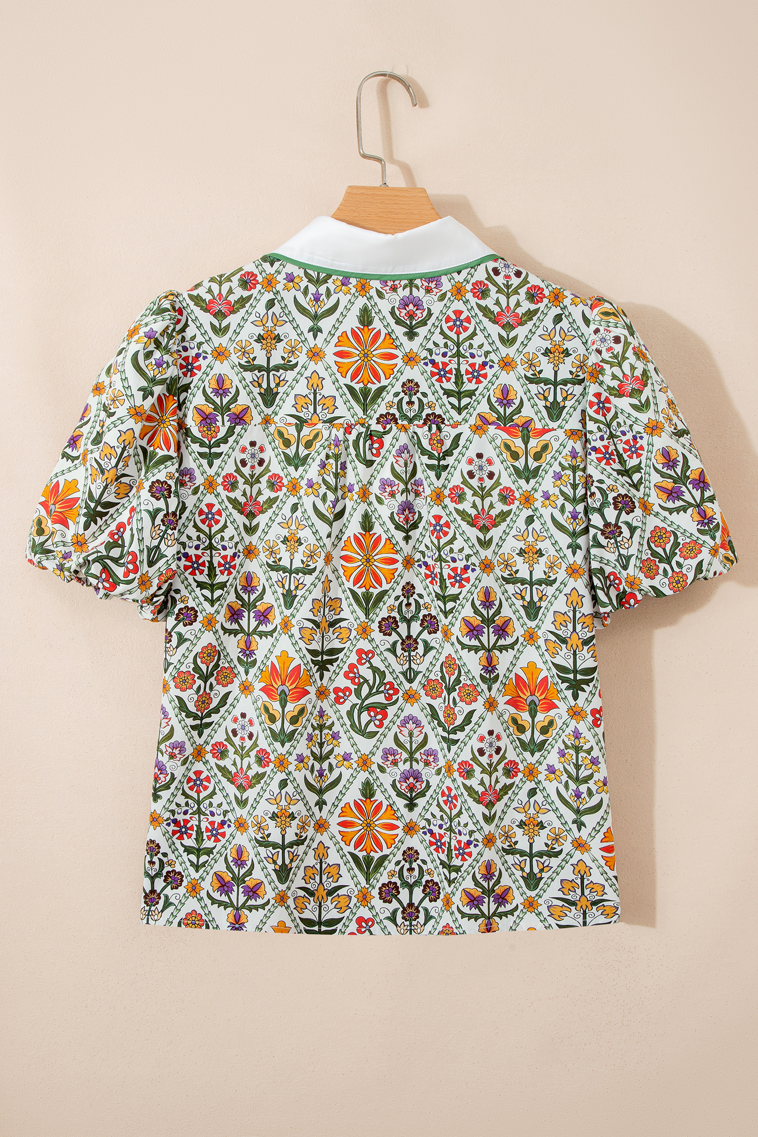 Women’s Floral Short Bubble Sleeve Shirt – Casual Green Shift Blouse for Office & Daily Wear