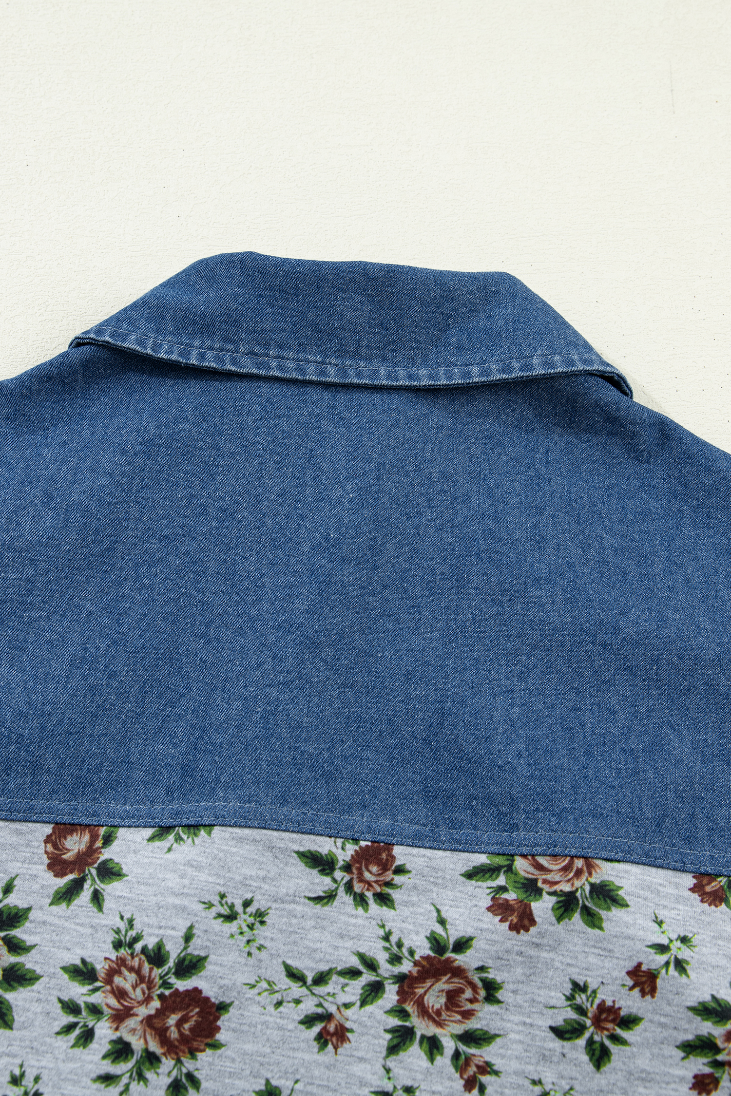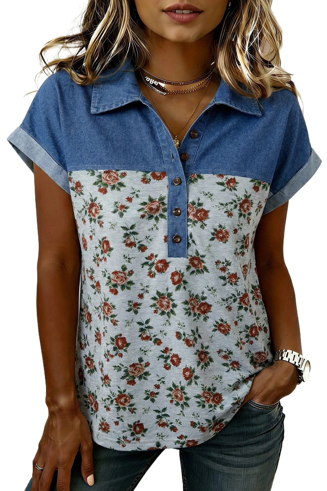 Women’s Gray Floral Print Denim Polo Collar Top – Stylish Casual Wear for Summer