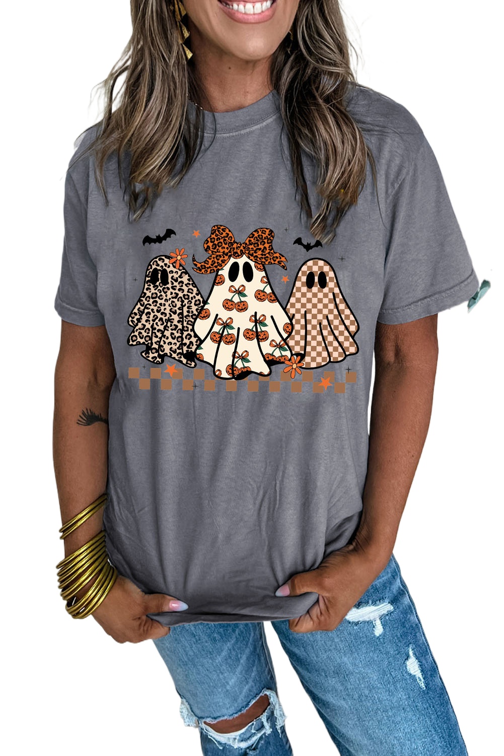 Women’s Gray Halloween Ghost Print Tee – Casual Short Sleeve Top for Festive Fun