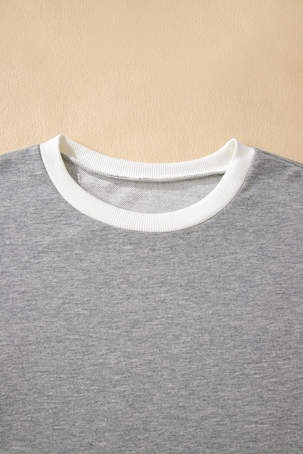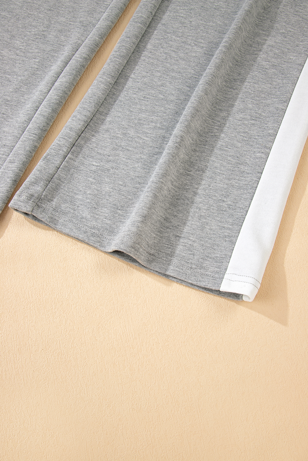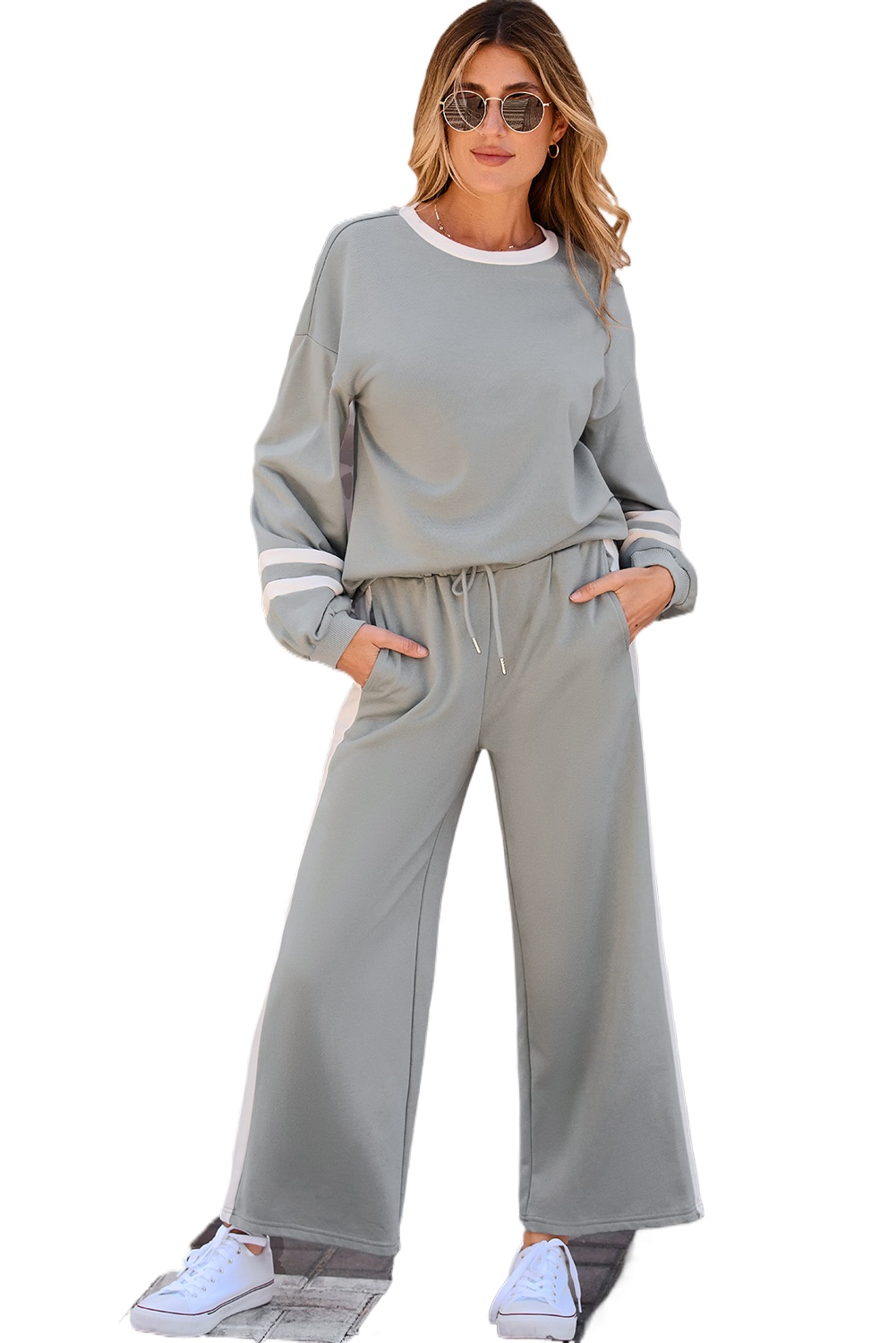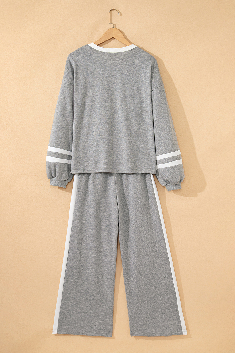 Women’s Gray Patchwork Puff Sleeve Pullover Set with Wide Leg Pants
