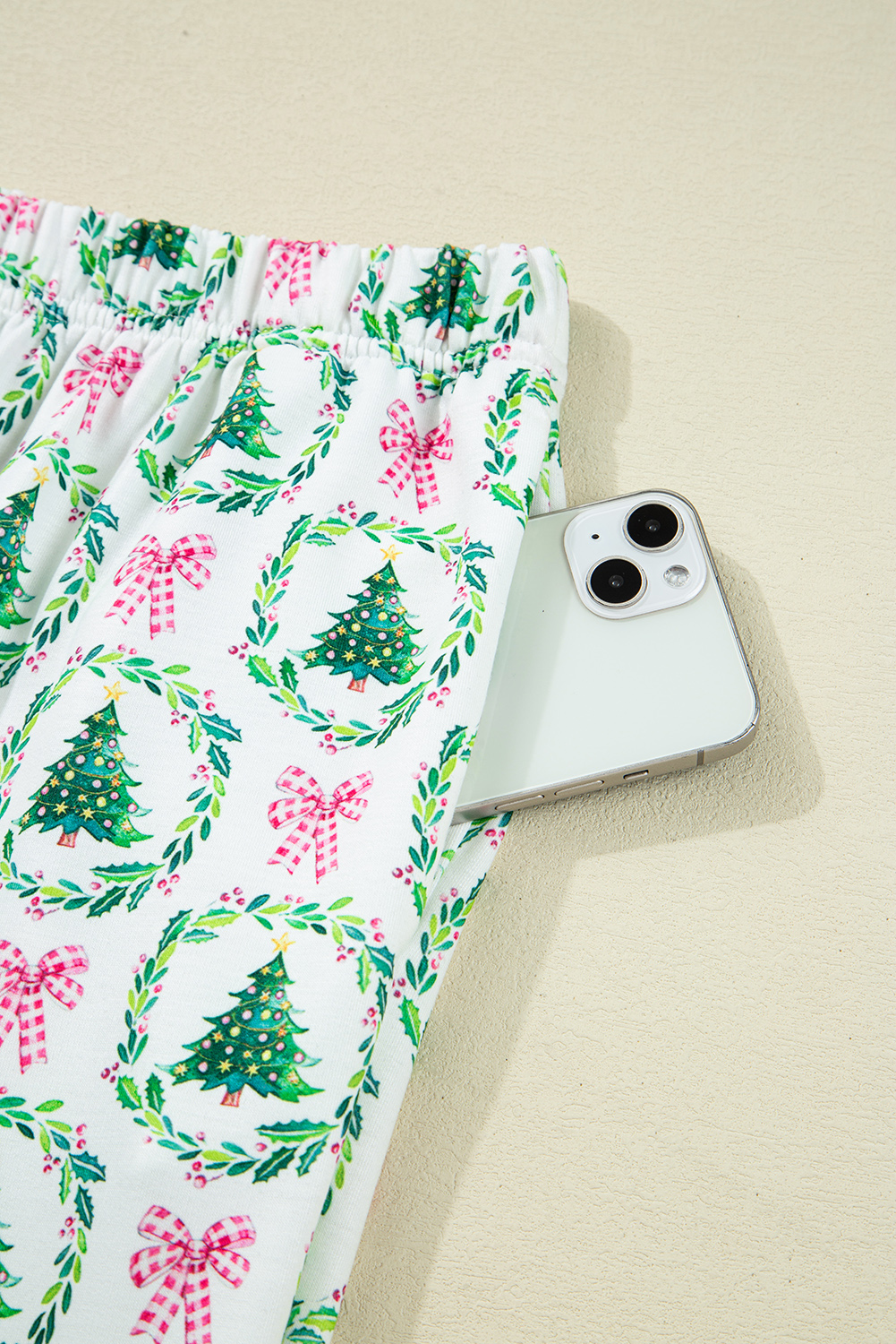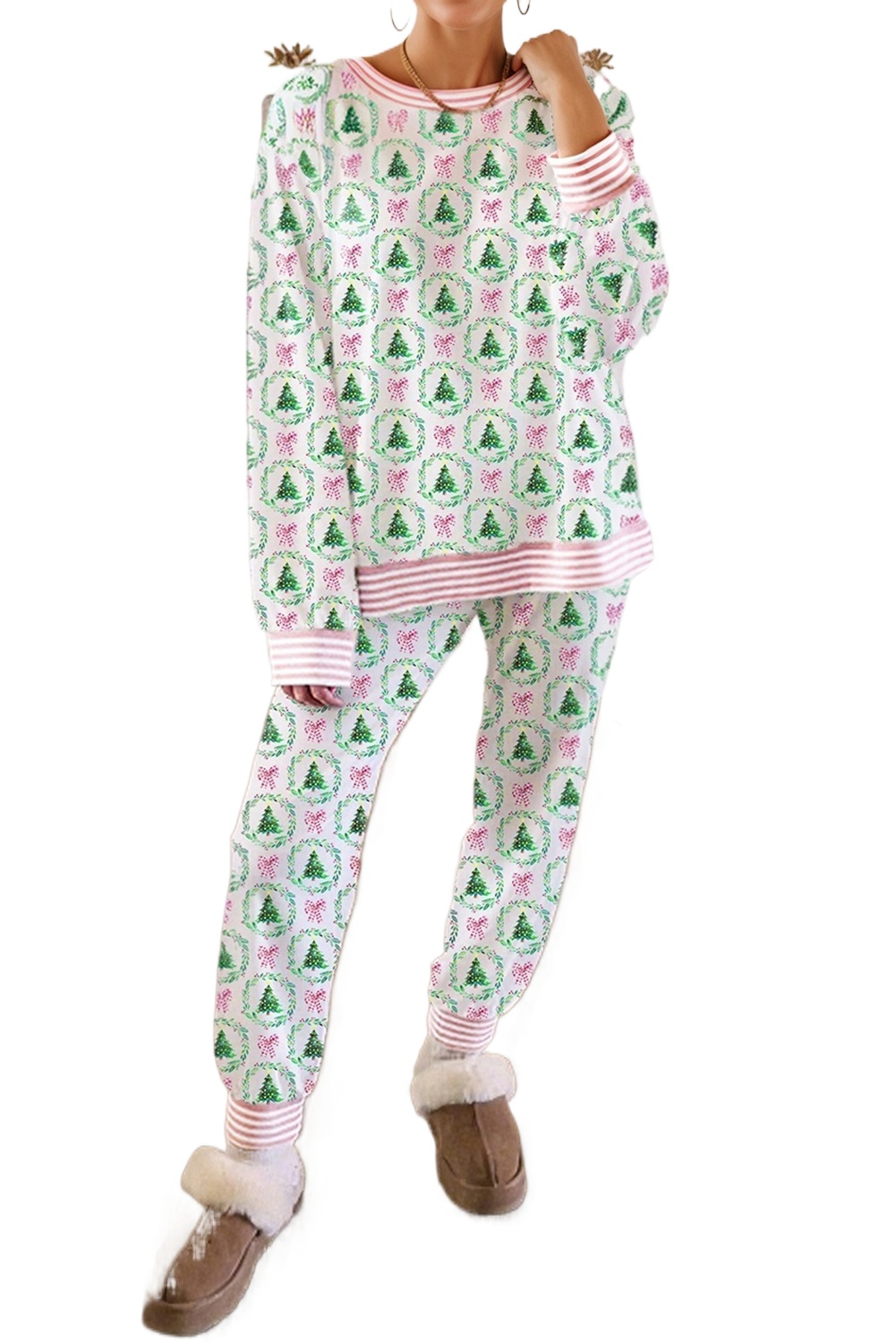Women’s Green Bow Christmas Tree Print Lounge Set – Cozy Contrast Striped Banding for Holiday Comfort