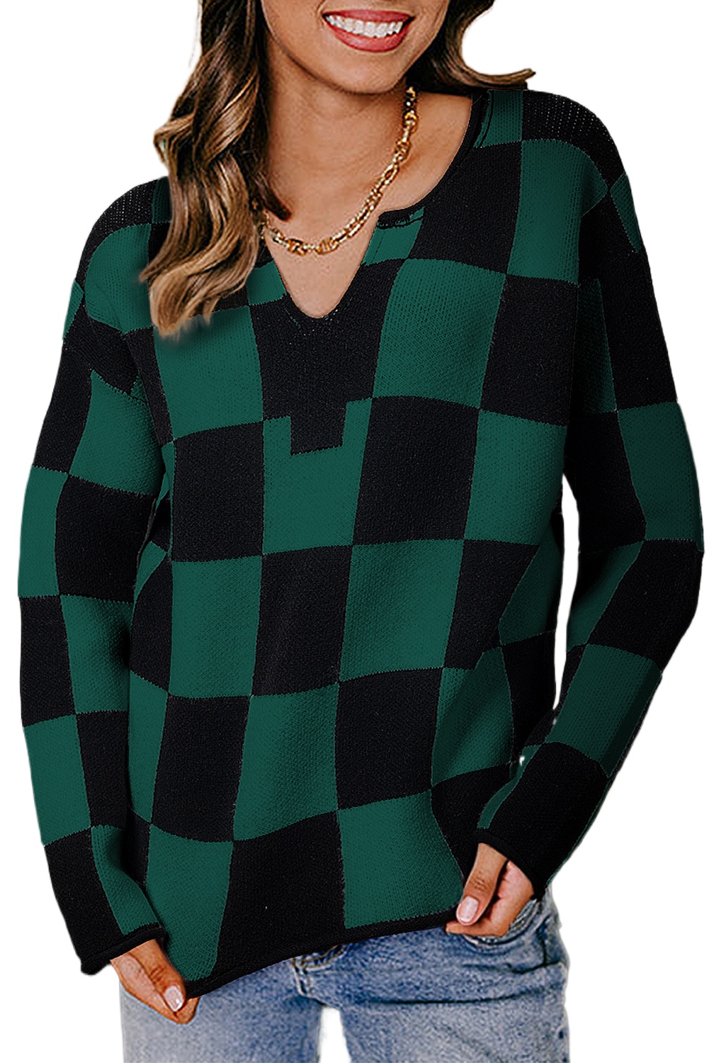 Women’s Green Checked Notched Neckline Drop Shoulder Knit Sweater for Casual Fall Style