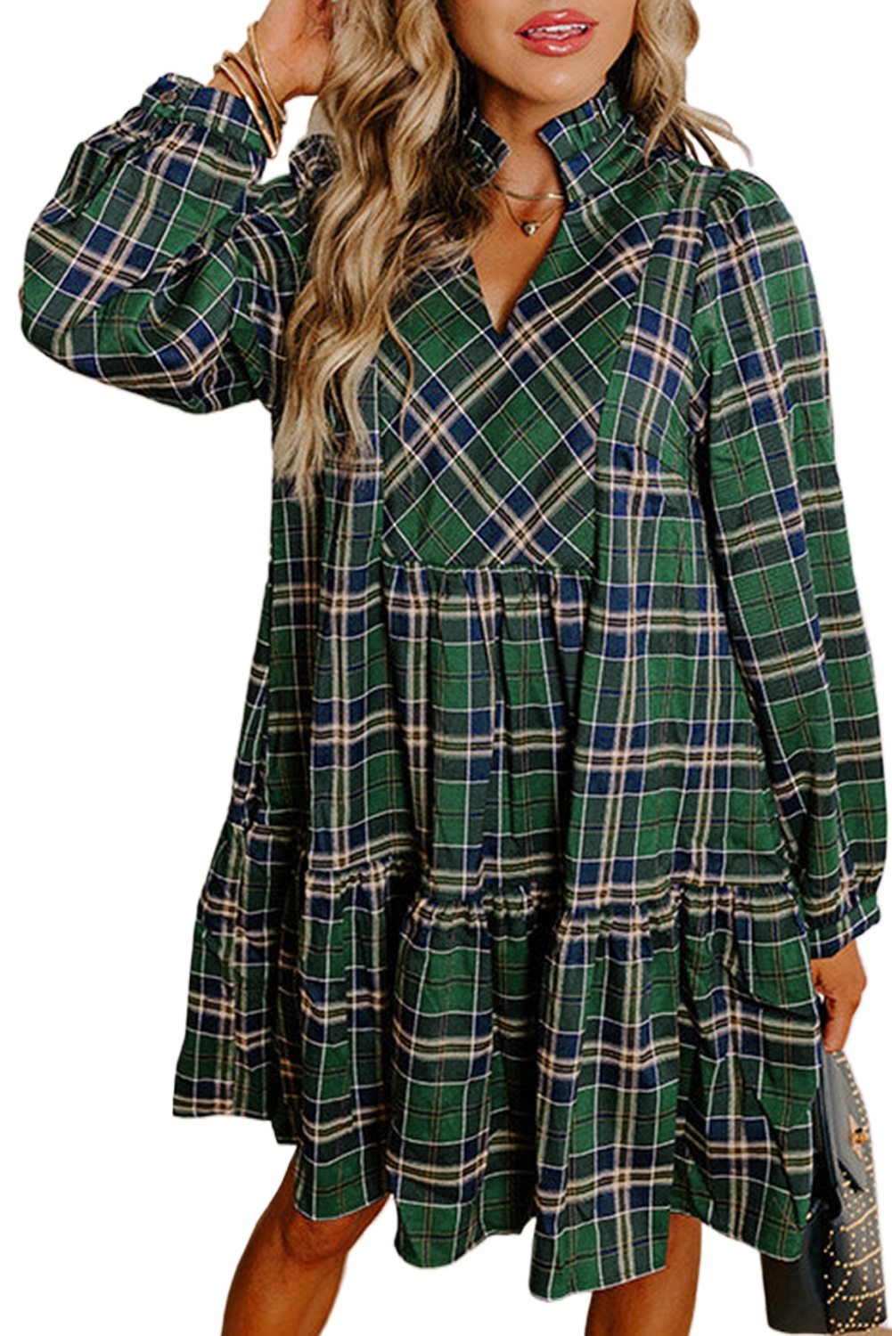 Women's Green Plaid Print Mini Dress with Frilly Collar – Perfect for Daily Casual Wear - Main ViewWomen’s Green Plaid Print Mini Dress with Frilly Collar – Perfect for Daily Casual Wear