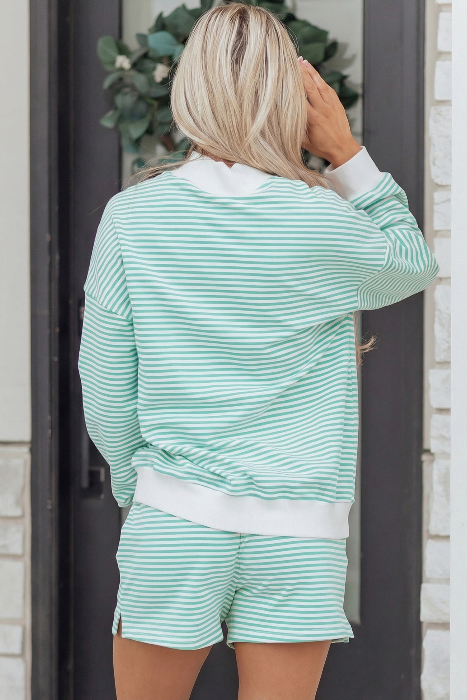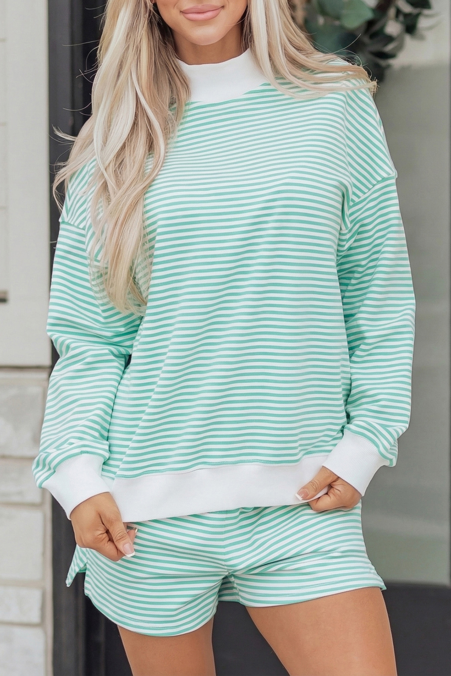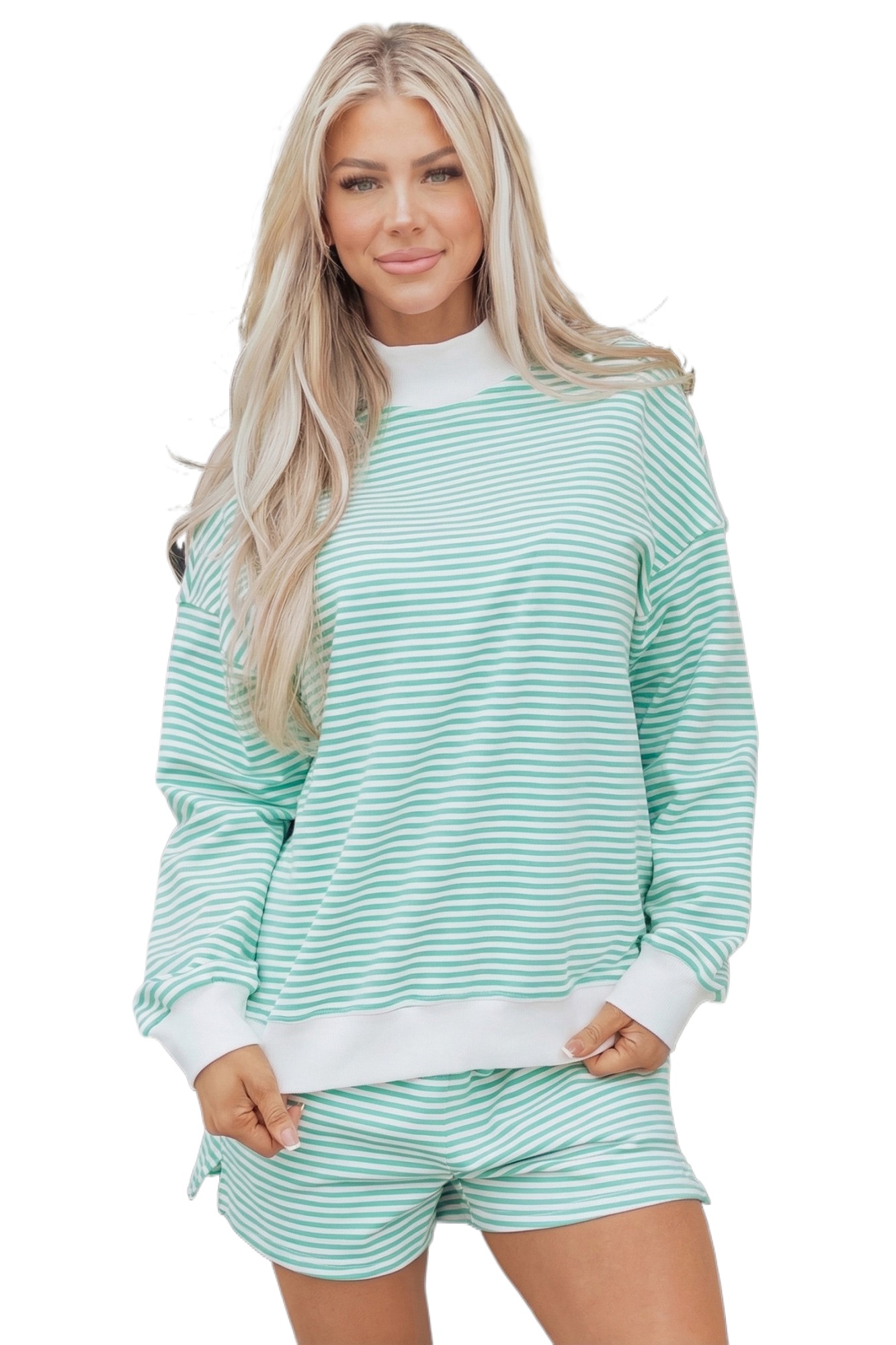 Women’s Green Stripe Oversize Mock Neck Sweatshirt and Shorts Set – Casual Two-Piece Lounge Outfit