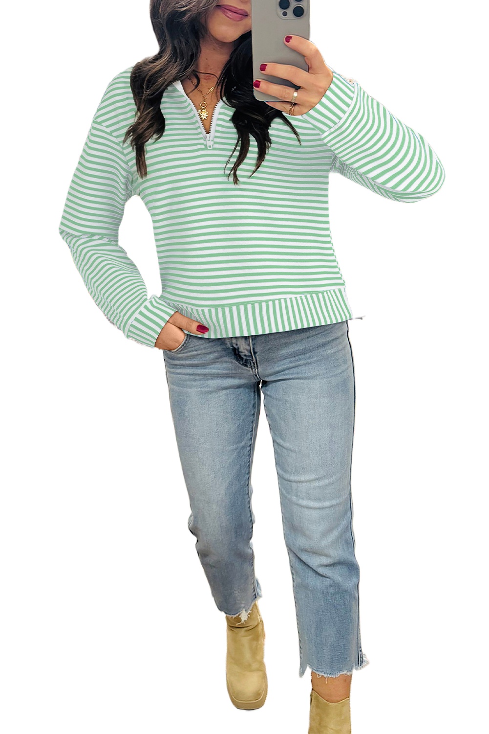 Women’s Green Stripe Quarter Zip Collar Pullover Long Sleeve Top