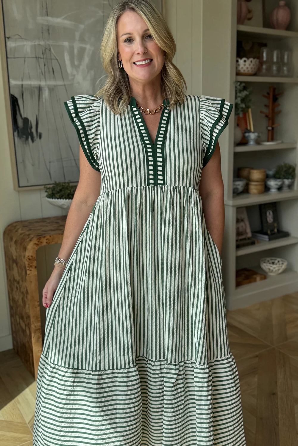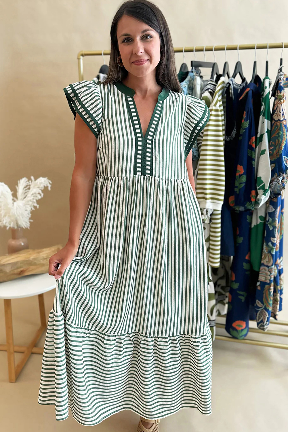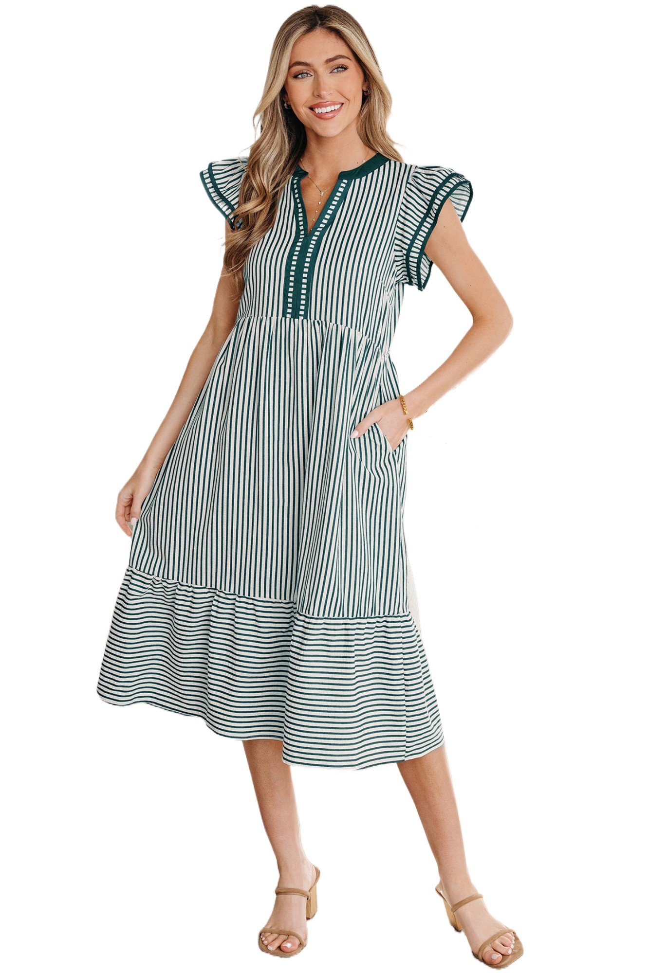 Women’s Green Stripe V Neck Midi Dress – Casual Summer Style with Ruffled Sleeves