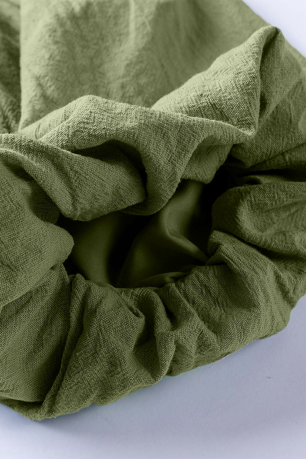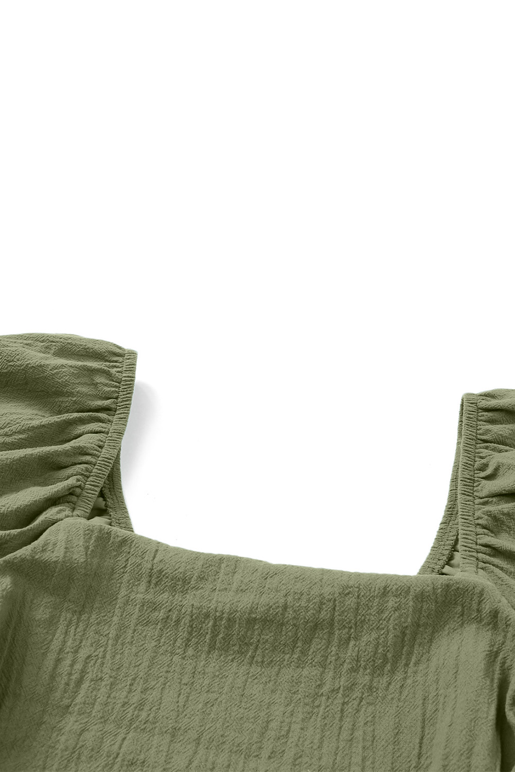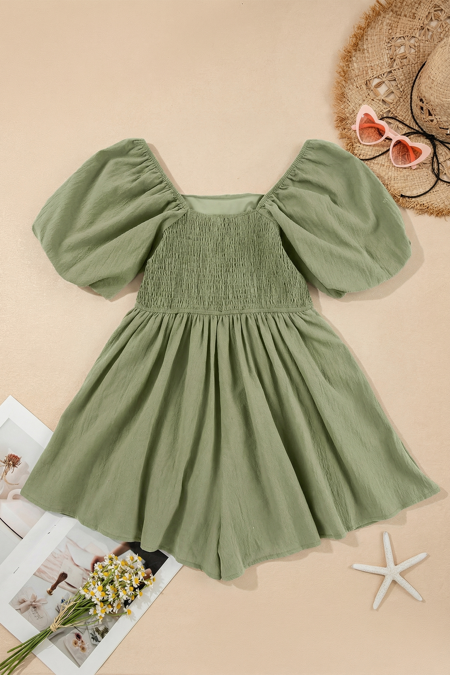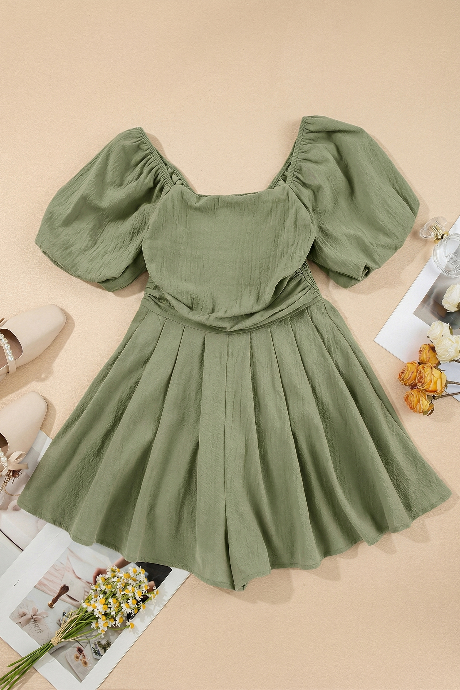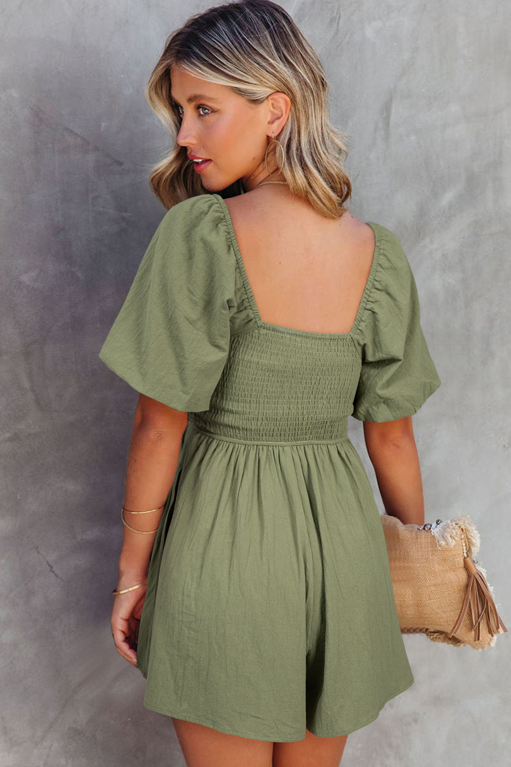 Women’s Jungle Green Square Neck Romper – Ruched Puff Sleeves, 100% Cotton for Casual Summer