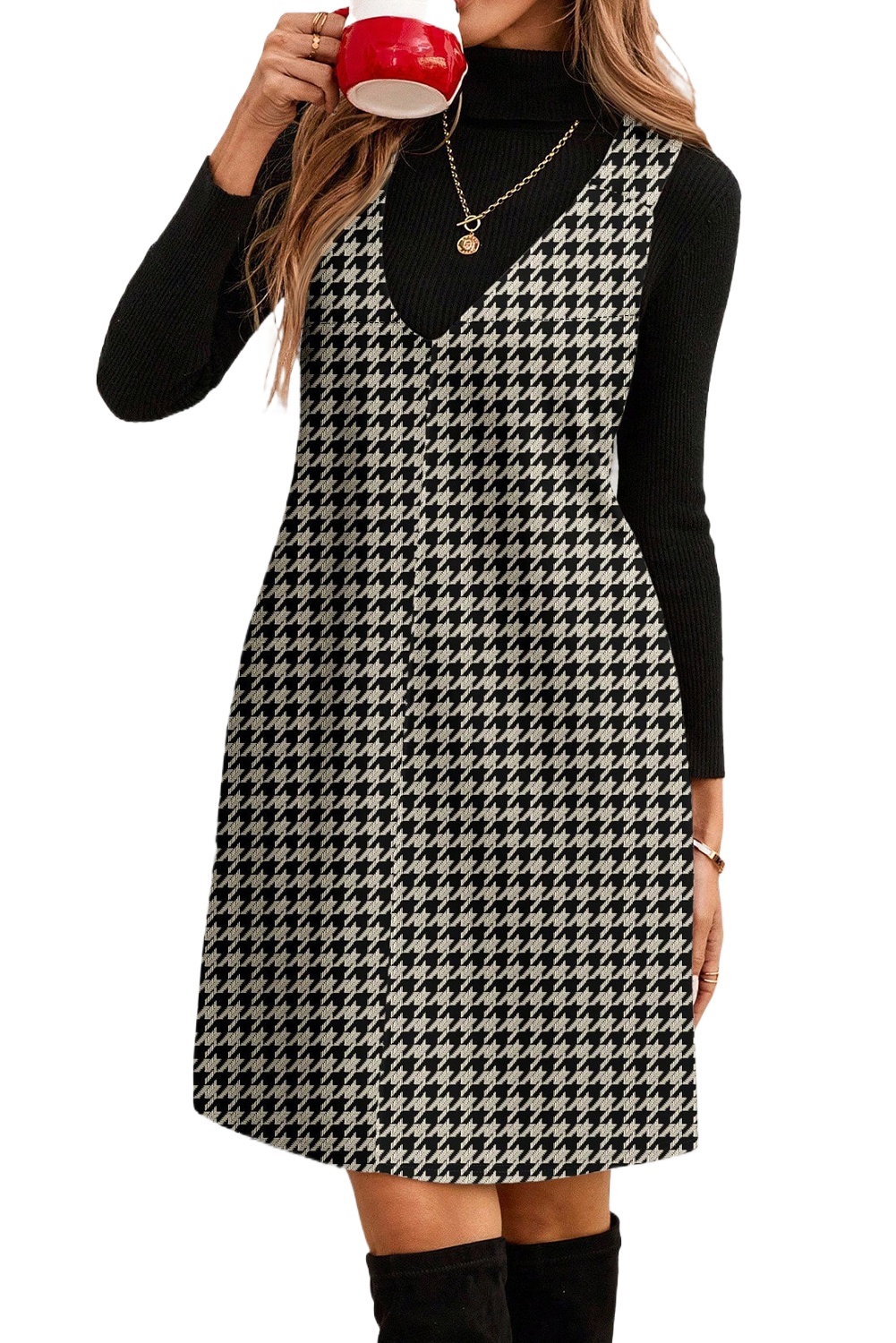 Women’s Khaki Houndstooth V-Neck Sleeveless Mini Dress for Office Wear