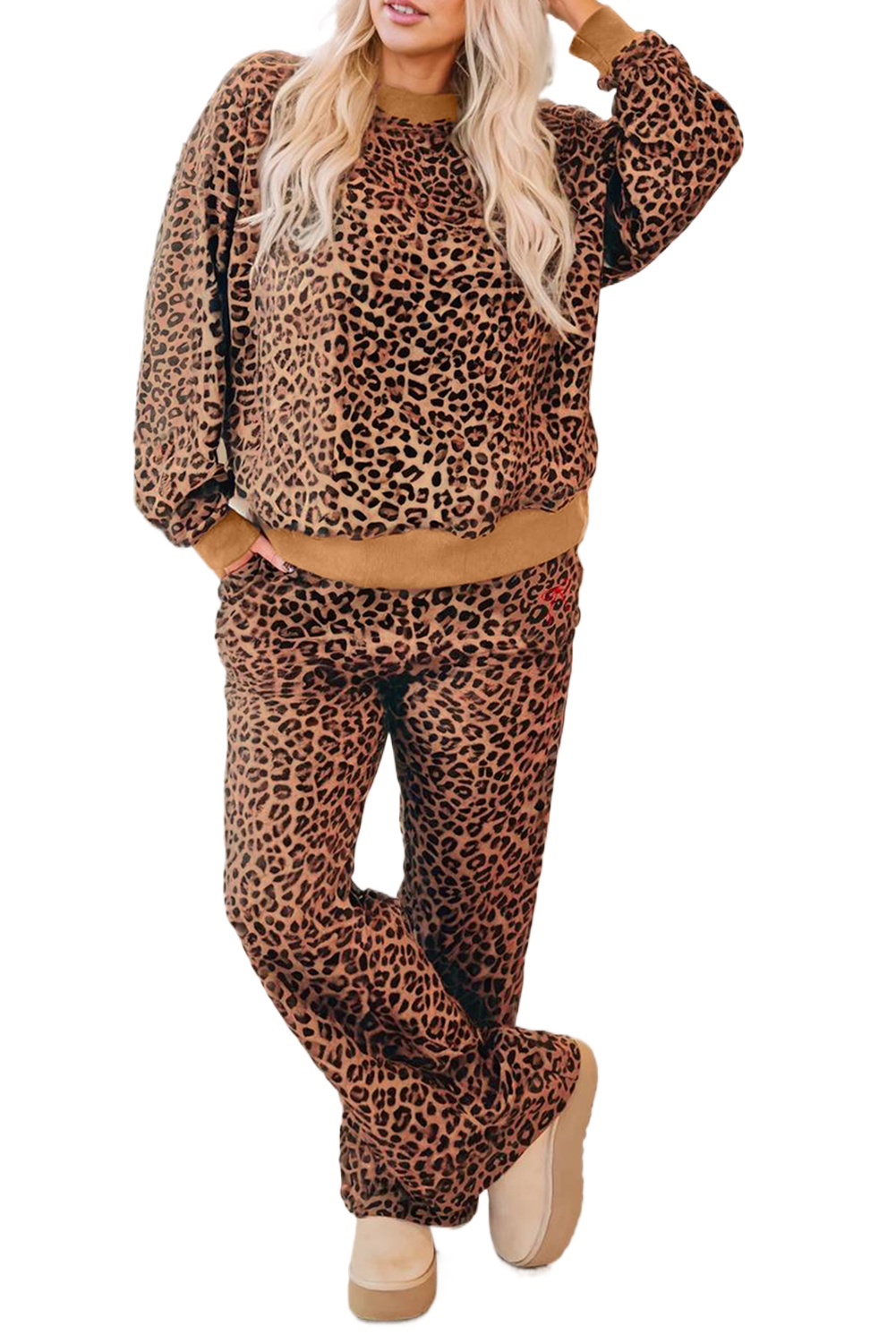 Women's Khaki Leopard Print Pullover and Wide-Leg Pants Set with Bow EmbroideryWomen’s Khaki Leopard Print Pullover and Wide-Leg Pants Set with Bow Embroidery