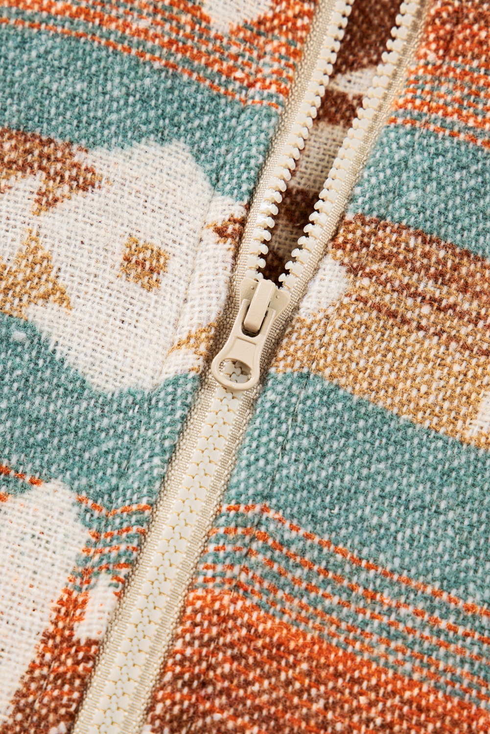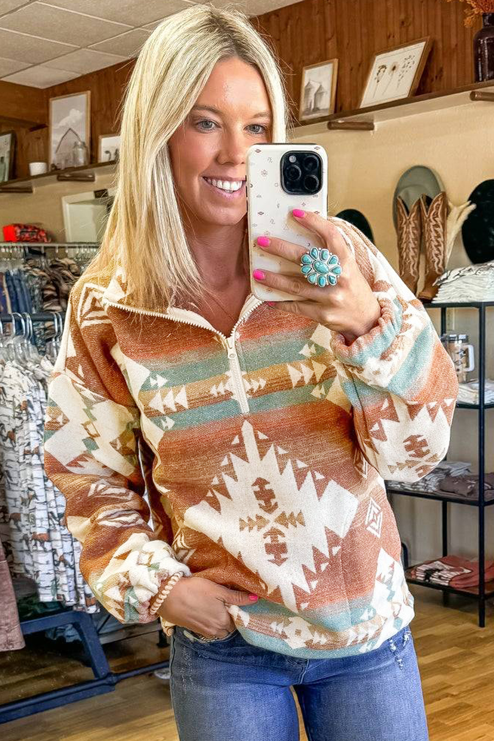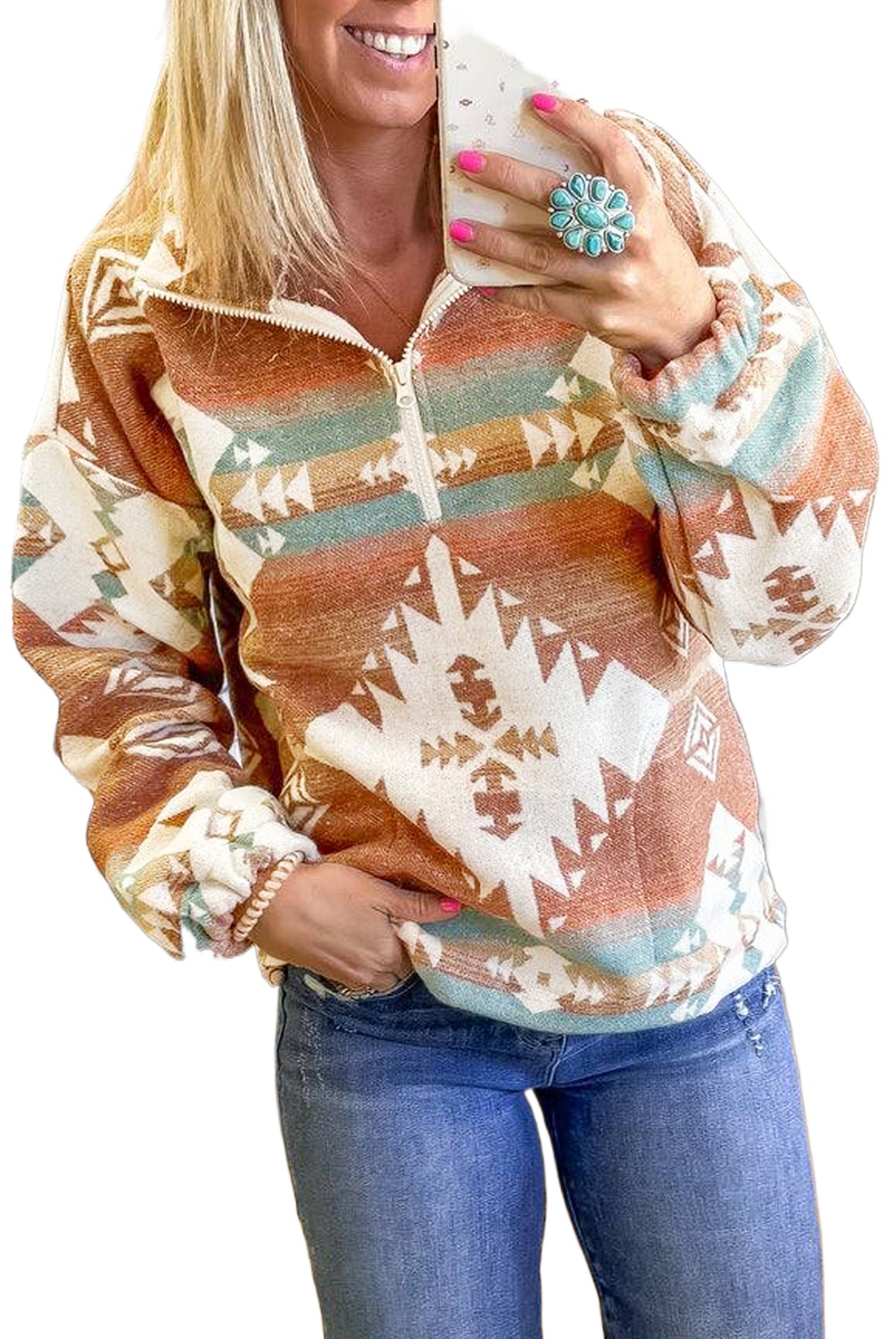 Women’s Khaki Quarter Zip Aztec Print Sweatshirt with Elastic Cuffs