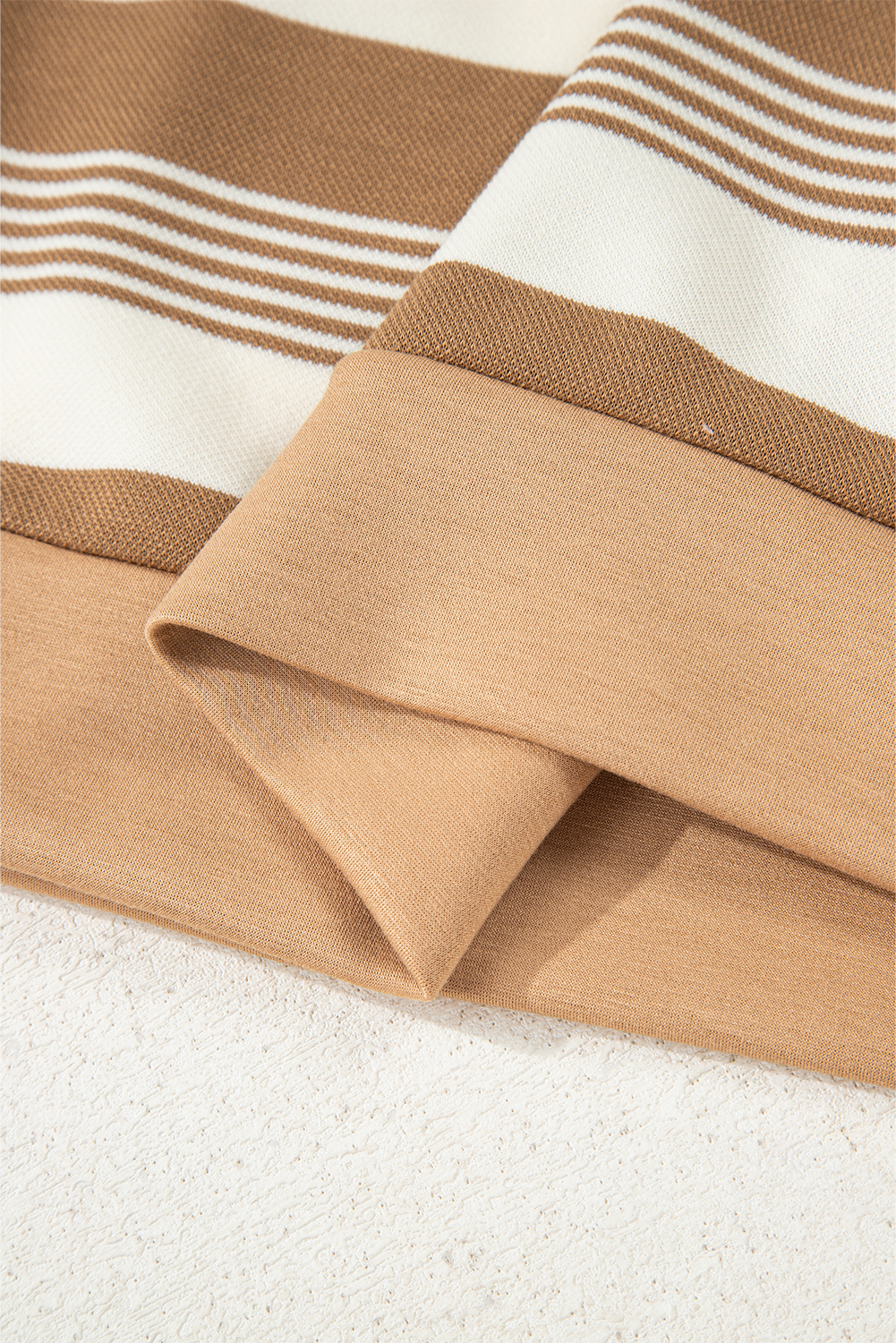 Women’s Khaki Striped Zip Collar Sweatshirt – Vintage Patchwork Casual Layer for Daily Wear