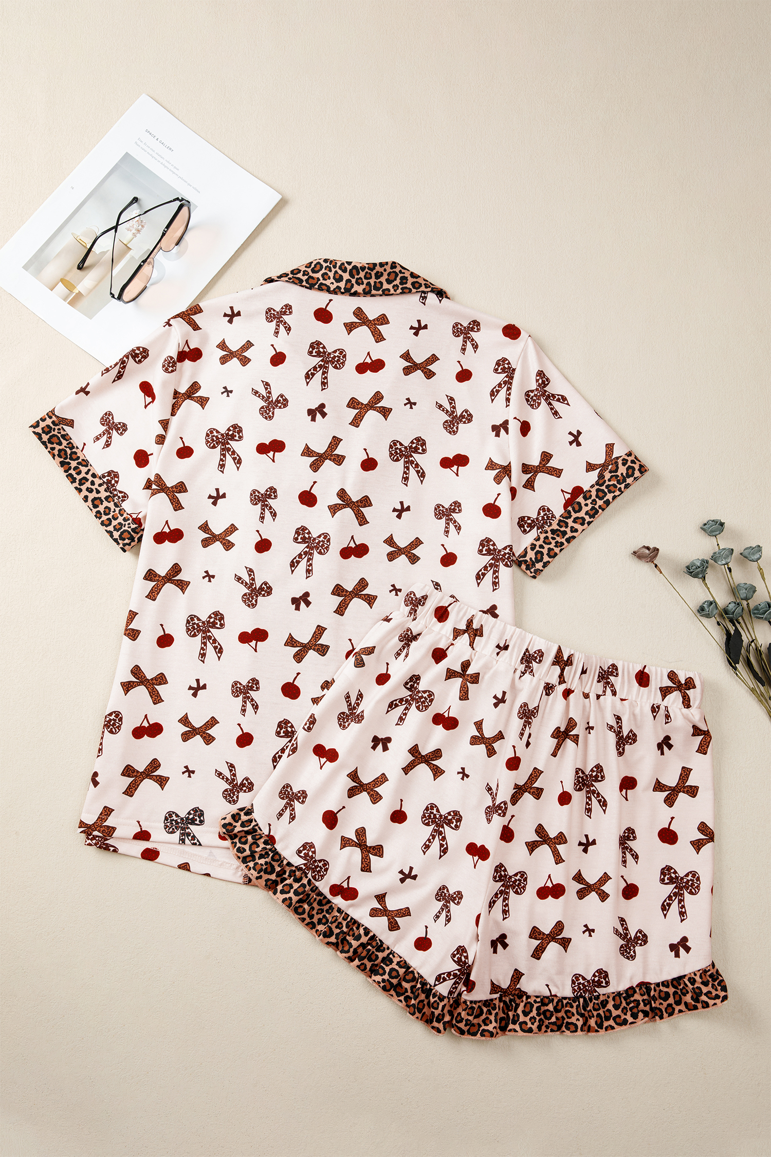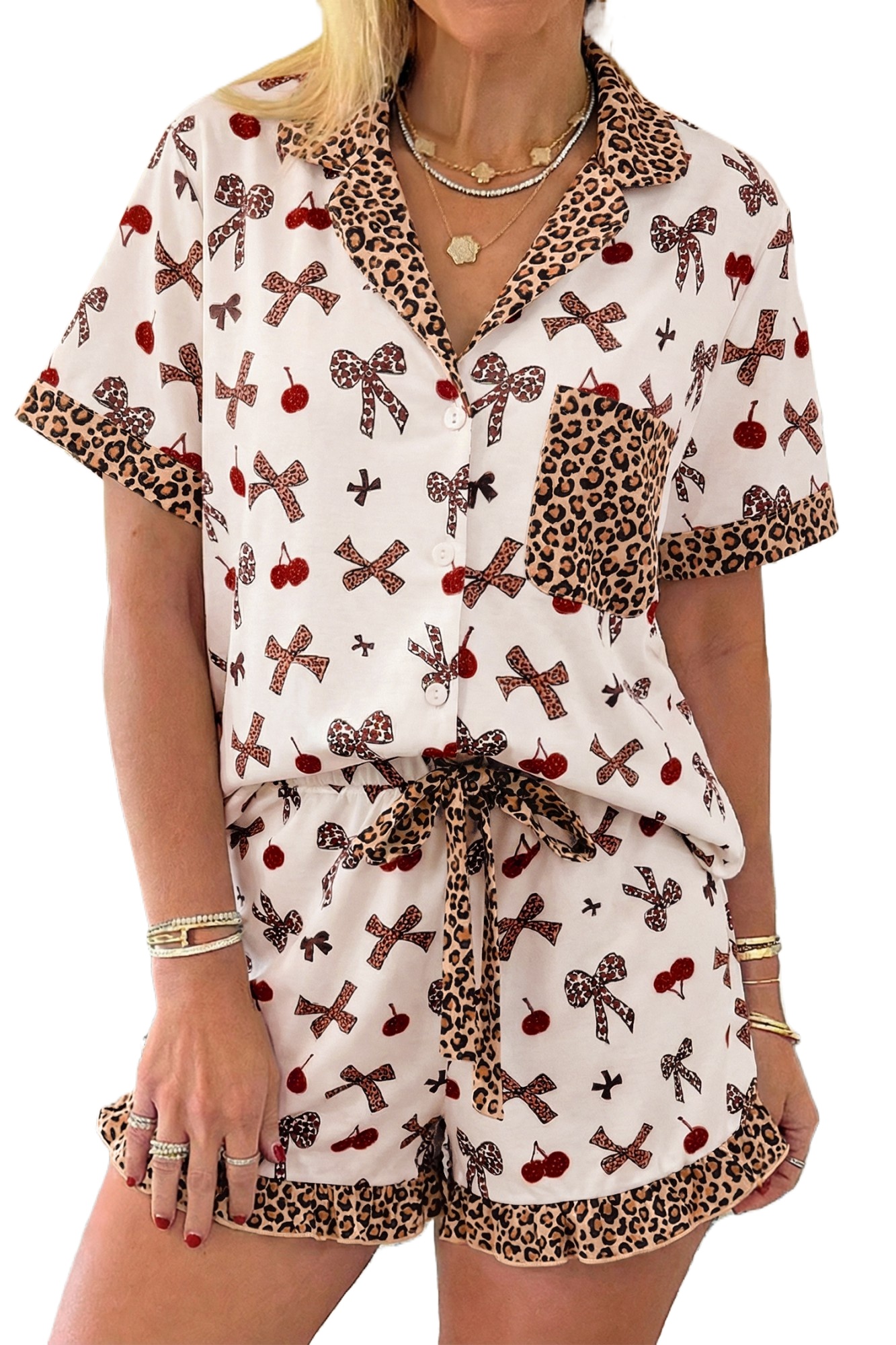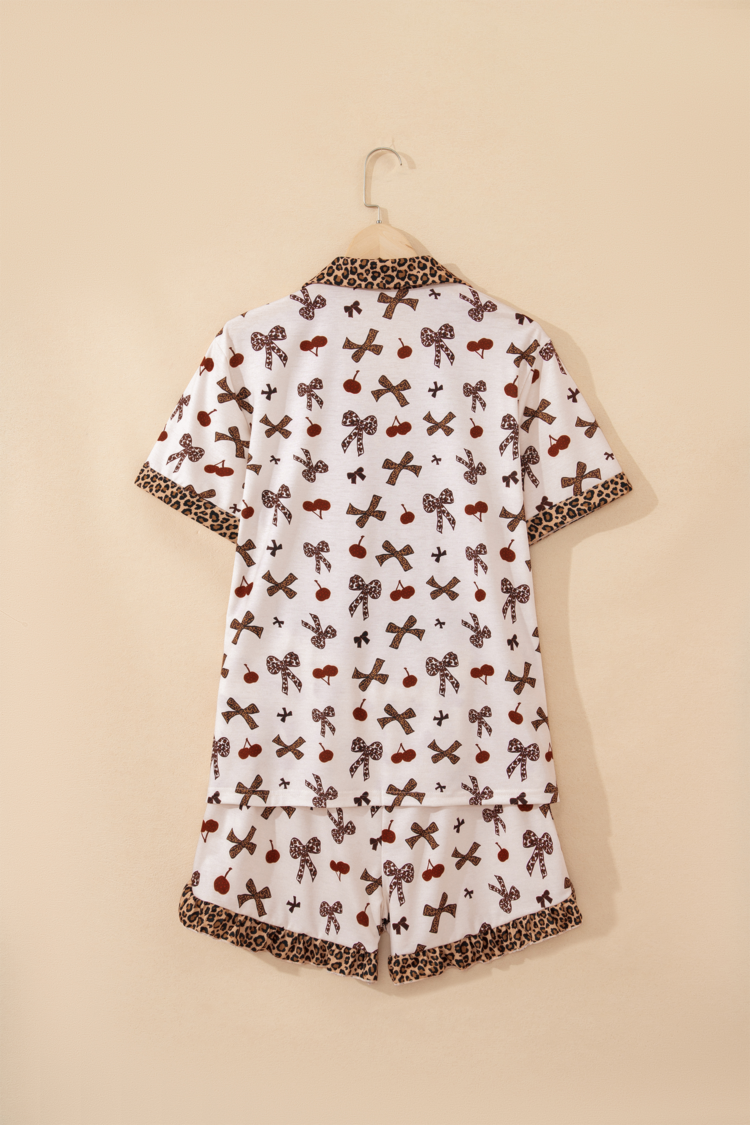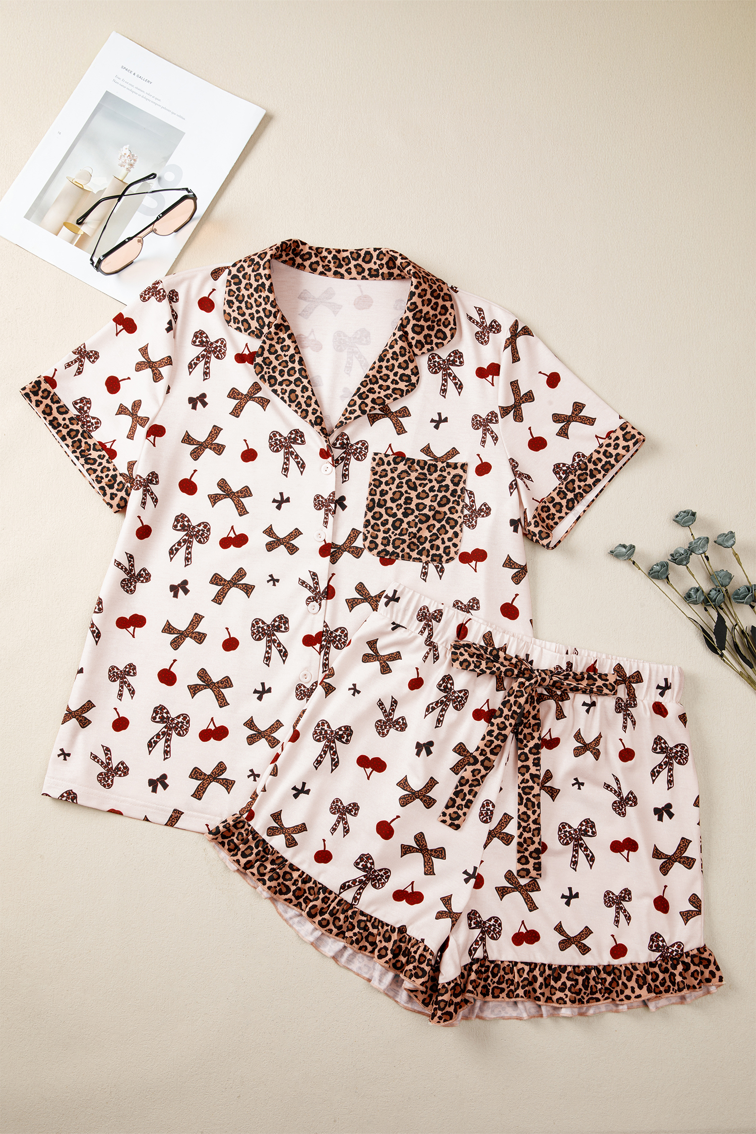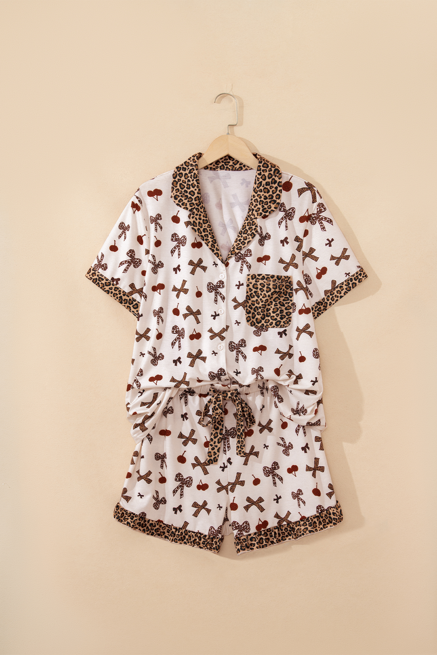 Women’s Leopard and Cherry Print Pajama Set – Short Sleeve Shirt and Drawstring Shorts
