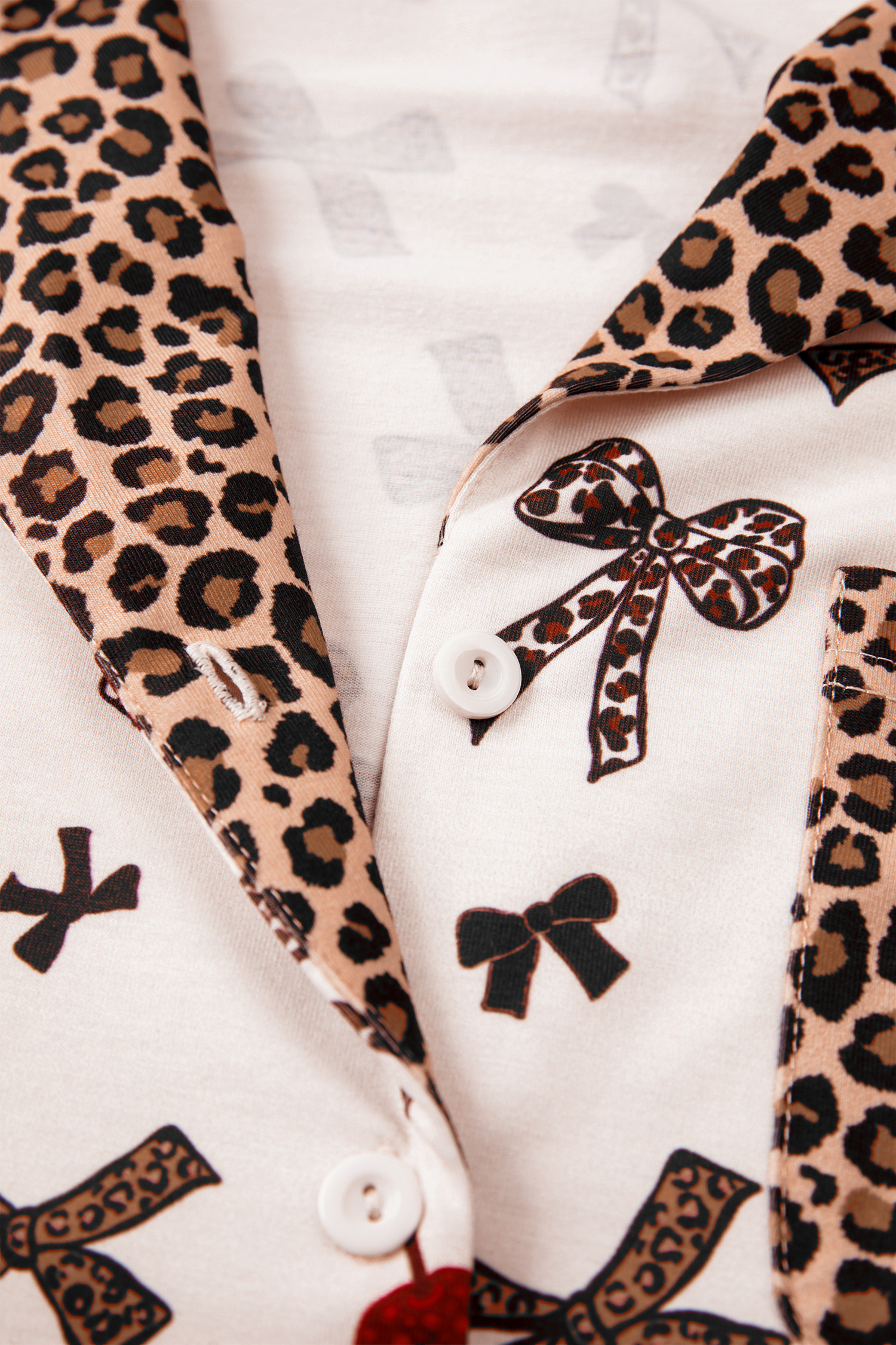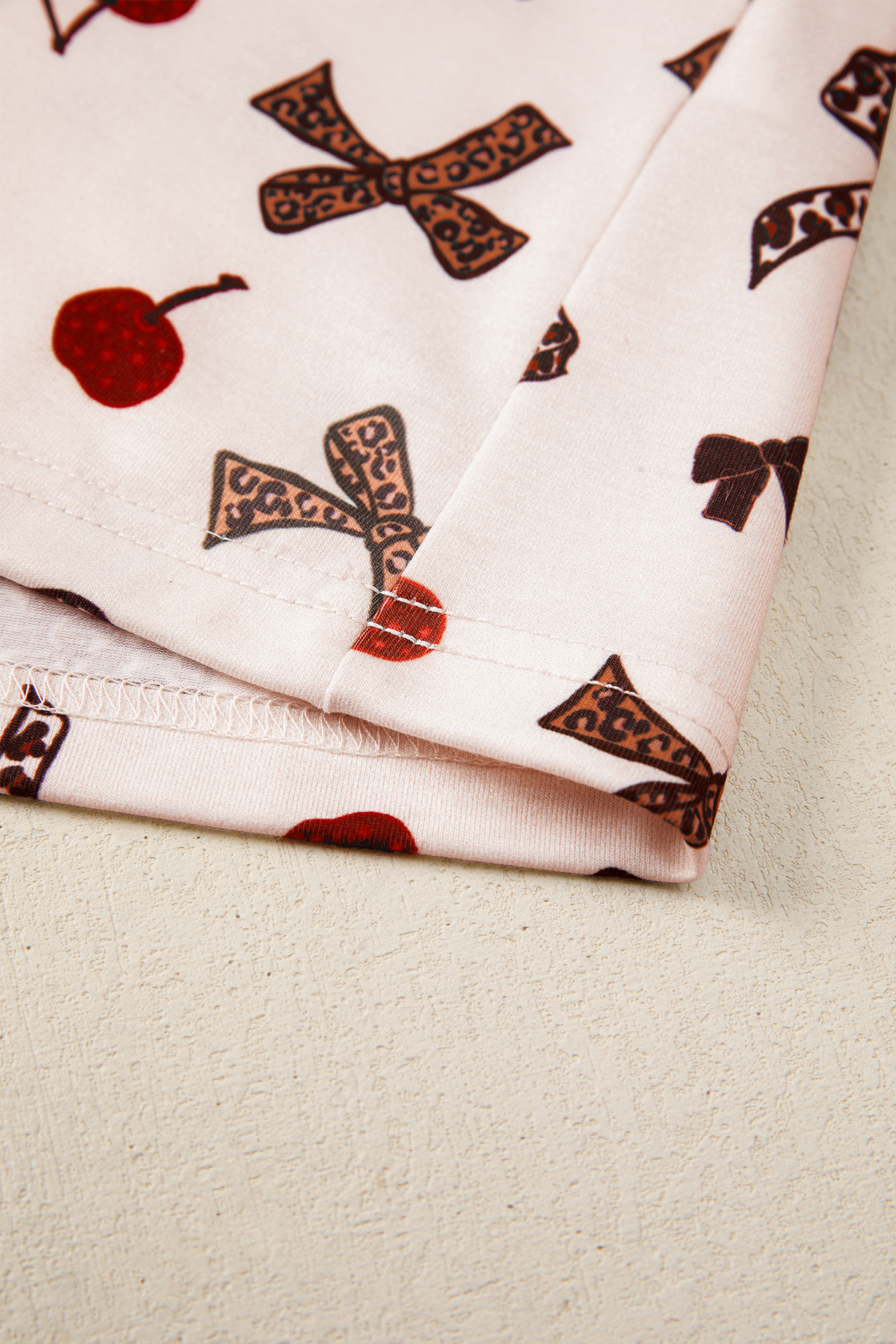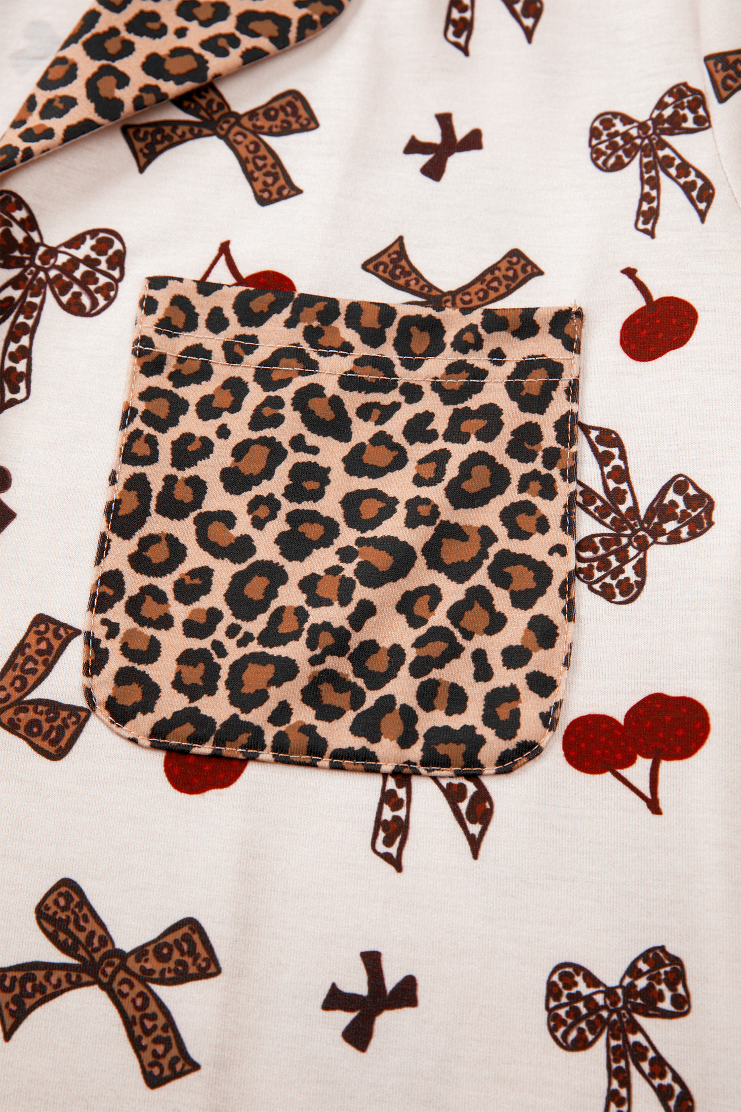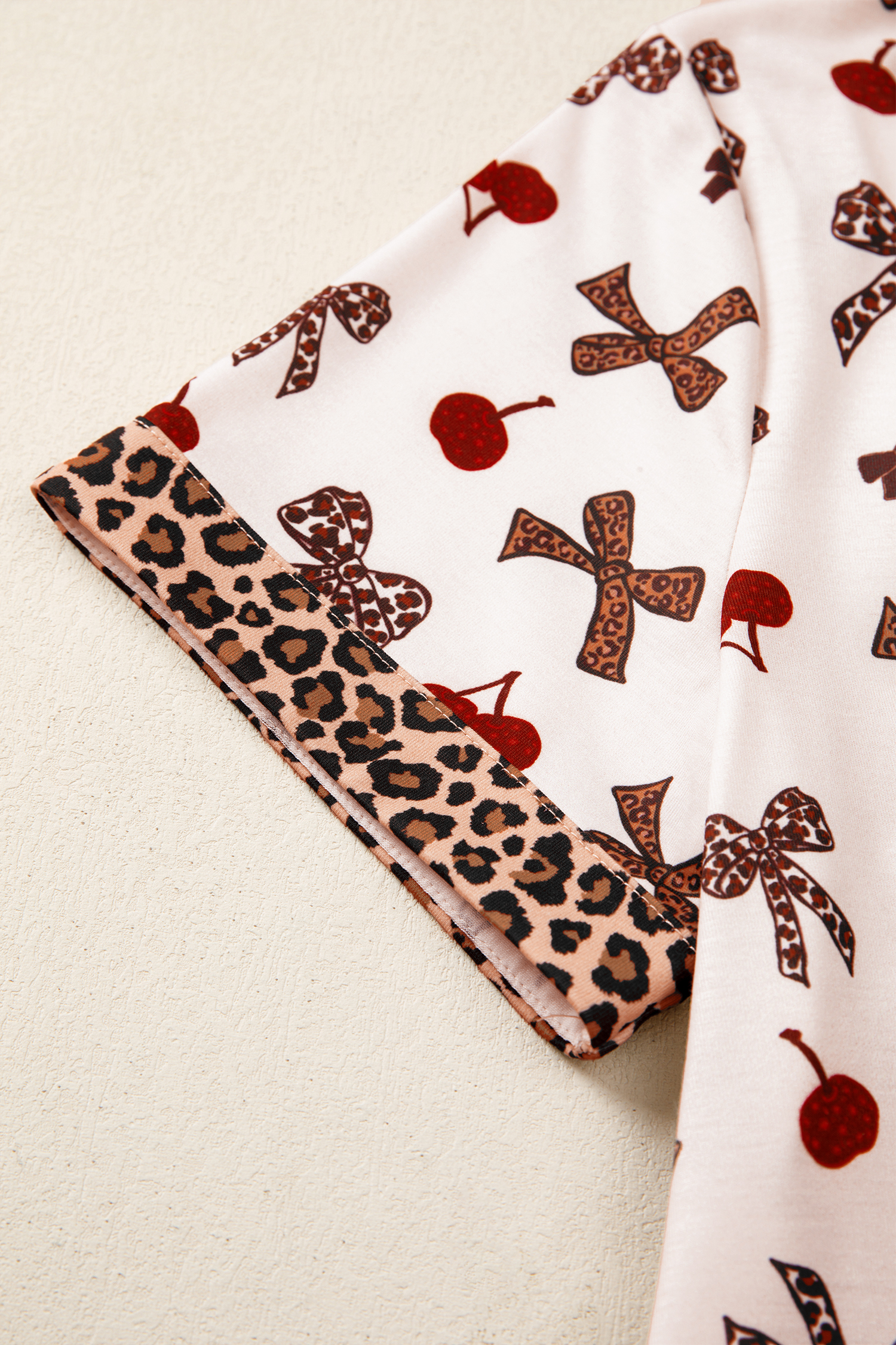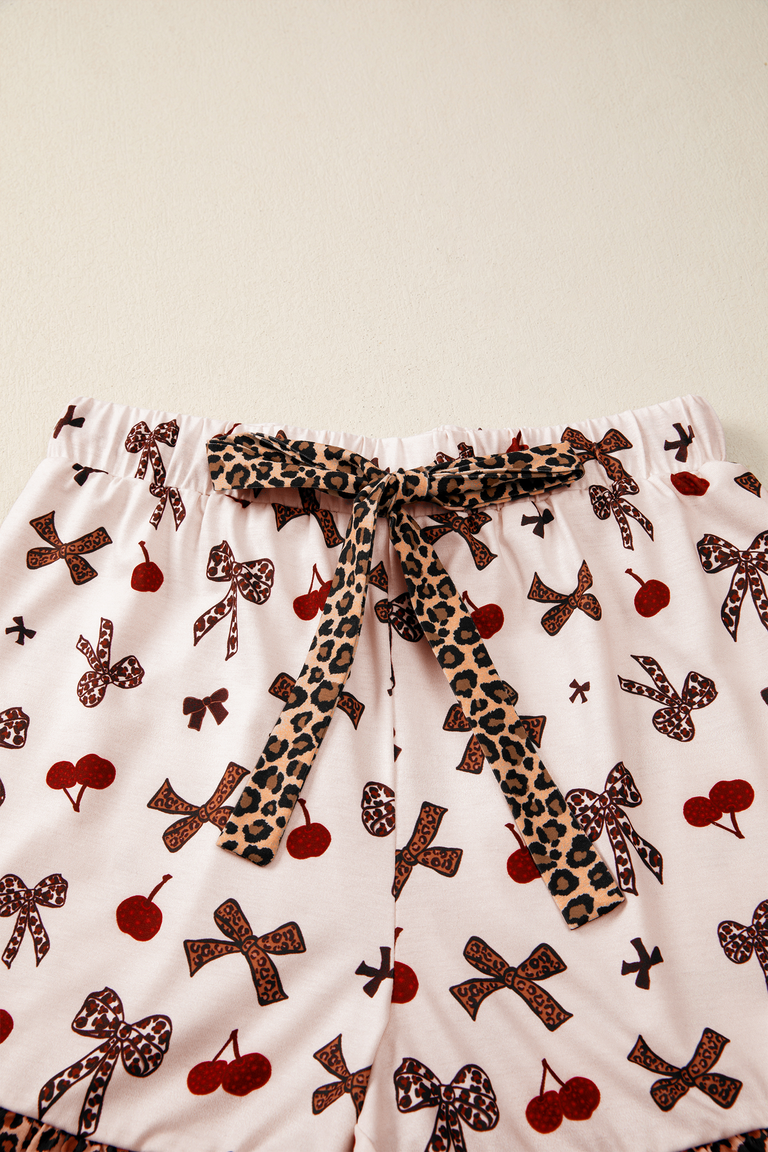 Women’s Leopard and Cherry Print Pajama Set – Short Sleeve Shirt and Drawstring Shorts