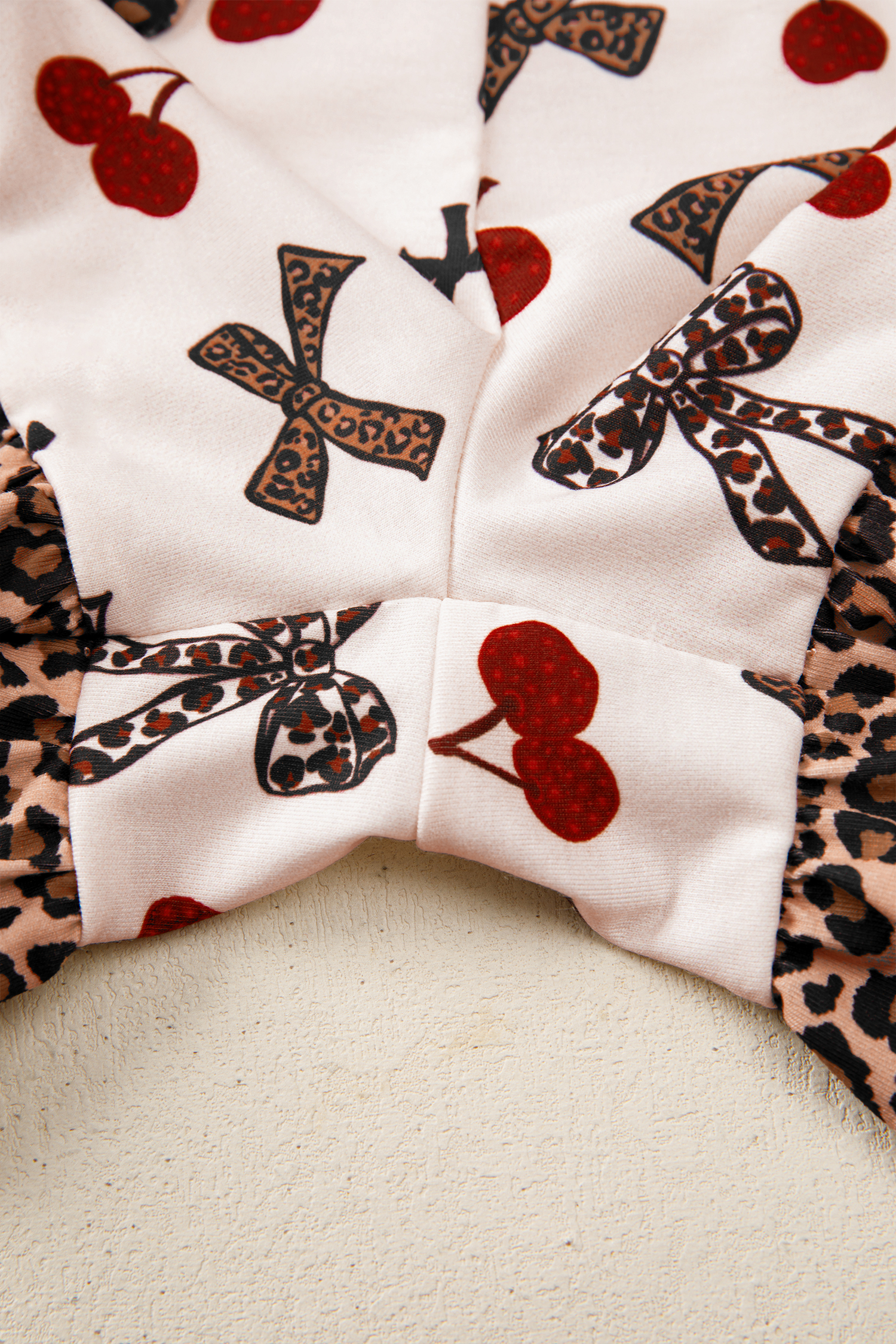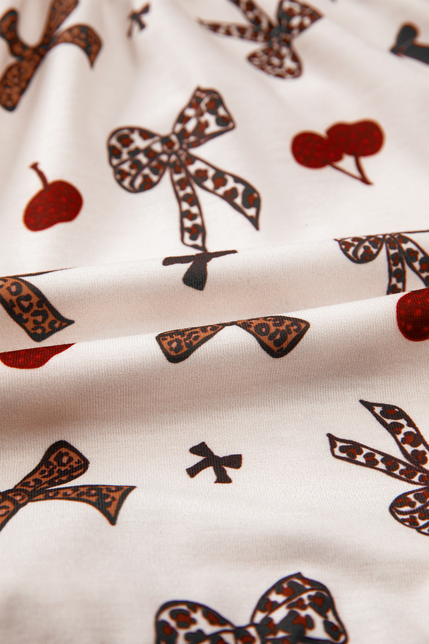 ✓ CHIC MIXED PRINT DESIGN: Features a playful combination of cherry and bow prints with bold leopard contrast patchwork for a unique, fashionable look while relaxing at home.