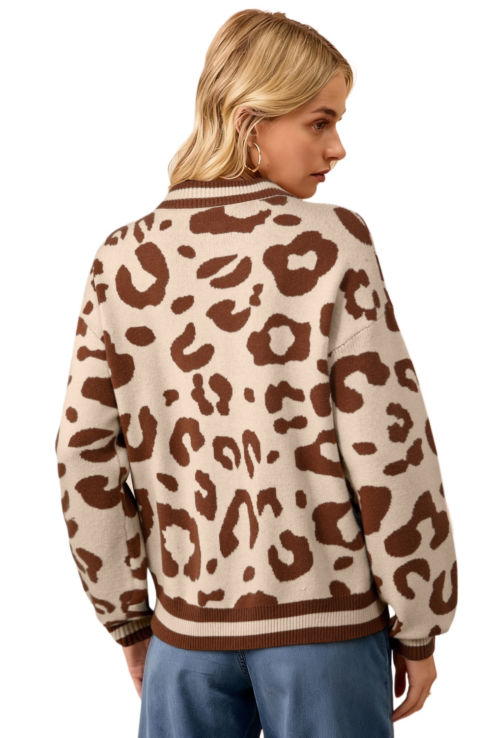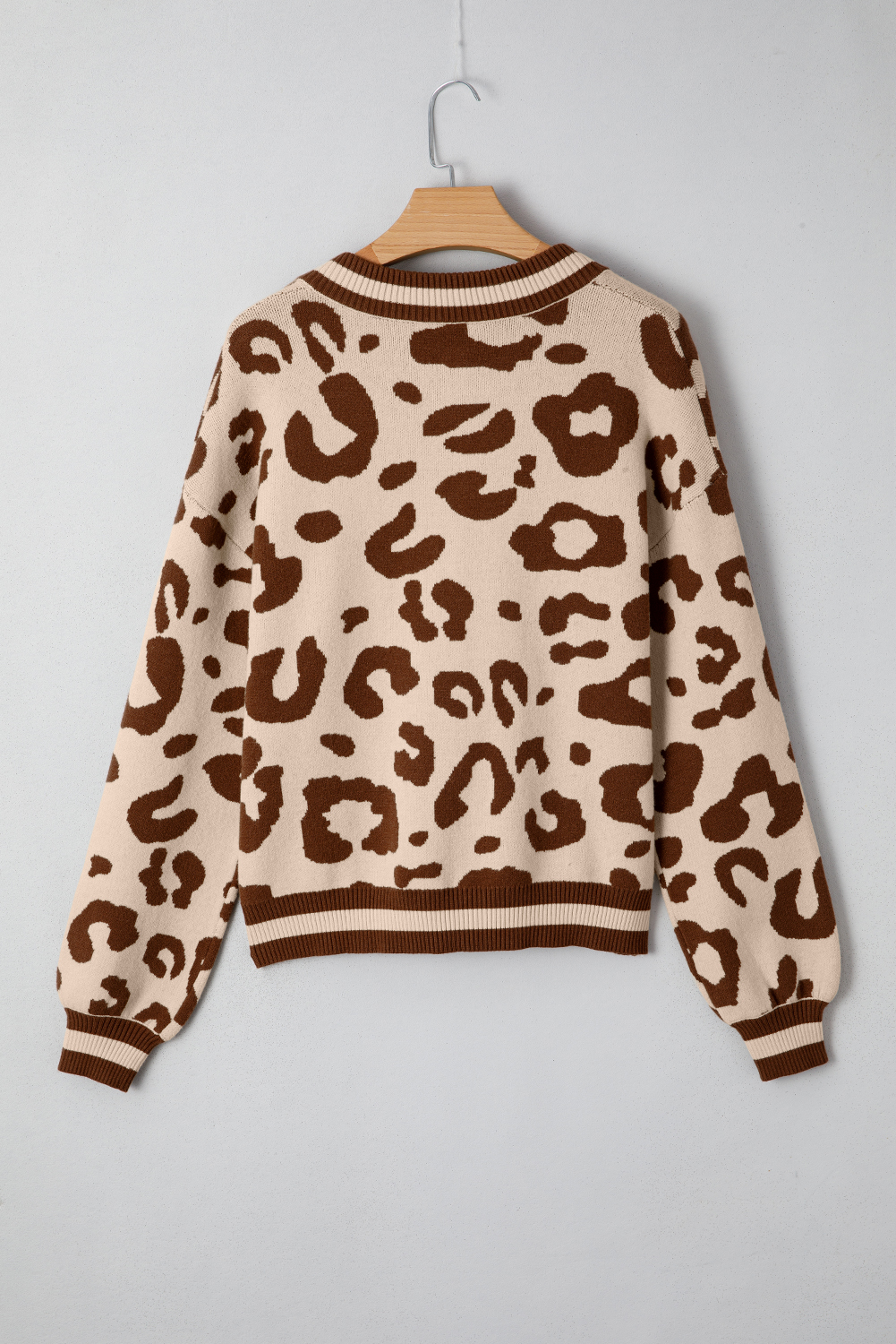 Women’s Light French Beige Leopard Print V-Neck Casual Sweater