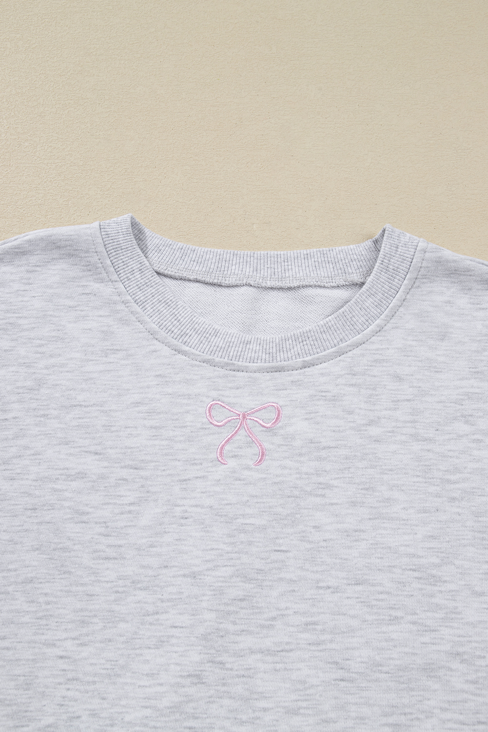 Women’s Light Grey Bow Embroidered Puff Sleeve Pullover – Casual 2-Piece Outfit for Everyday Elegance