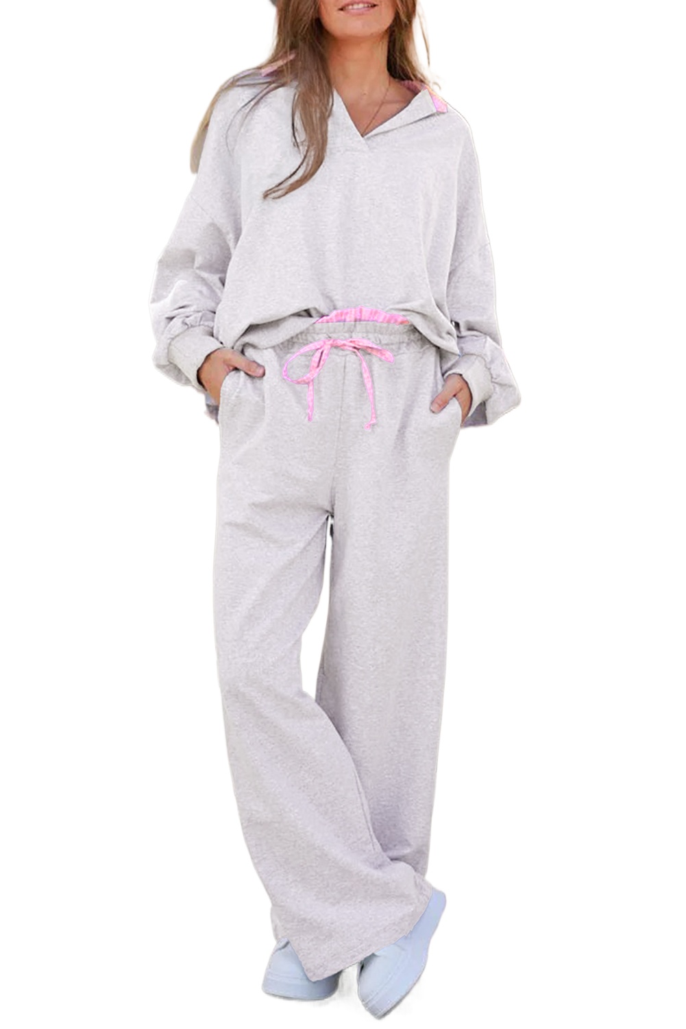 Women’s Light Grey Frilled Collar Pullover and Drawstring Pant Set – Casual Autumn Ensemble
