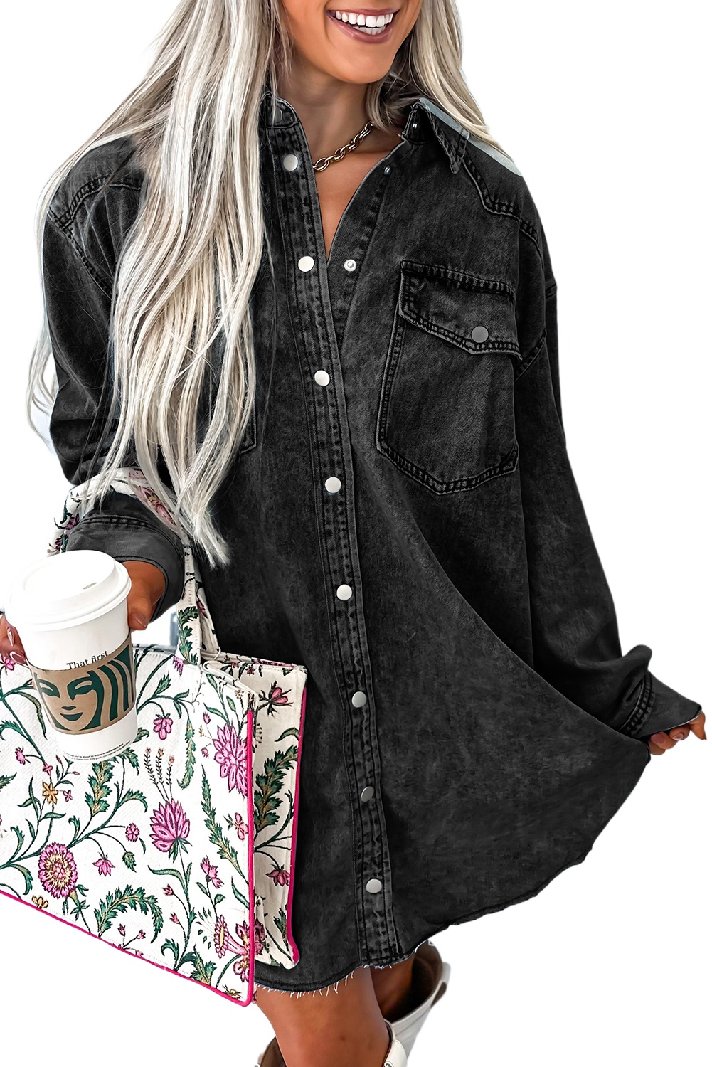 Women's Medium Grey Denim Shirt Dress with Chest Pocket – Loose Fit Long Sleeve Casual Daily WearWomen’s Medium Grey Denim Shirt Dress with Chest Pocket – Loose Fit Long Sleeve Casual Daily Wear