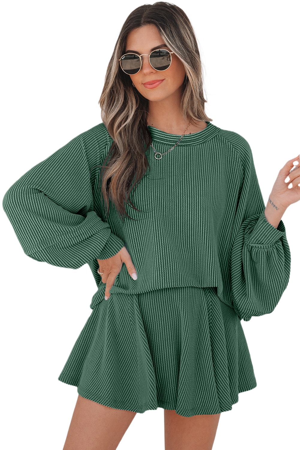 Women’s Mist Green Corded Lantern Sleeve Top and High Waist Ruffled Mini Skirt Set for Daily Casual Wear