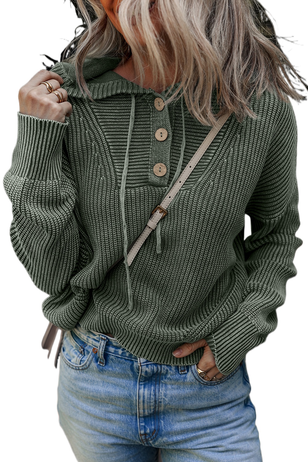 Women’s Mist Green Mineral Wash Hooded Sweater – Ribbed Knit Button Drawstring Neck for Casual Daily Wear