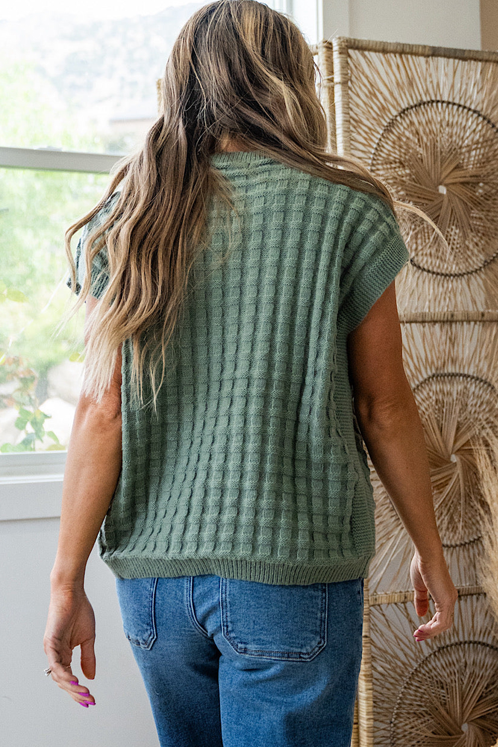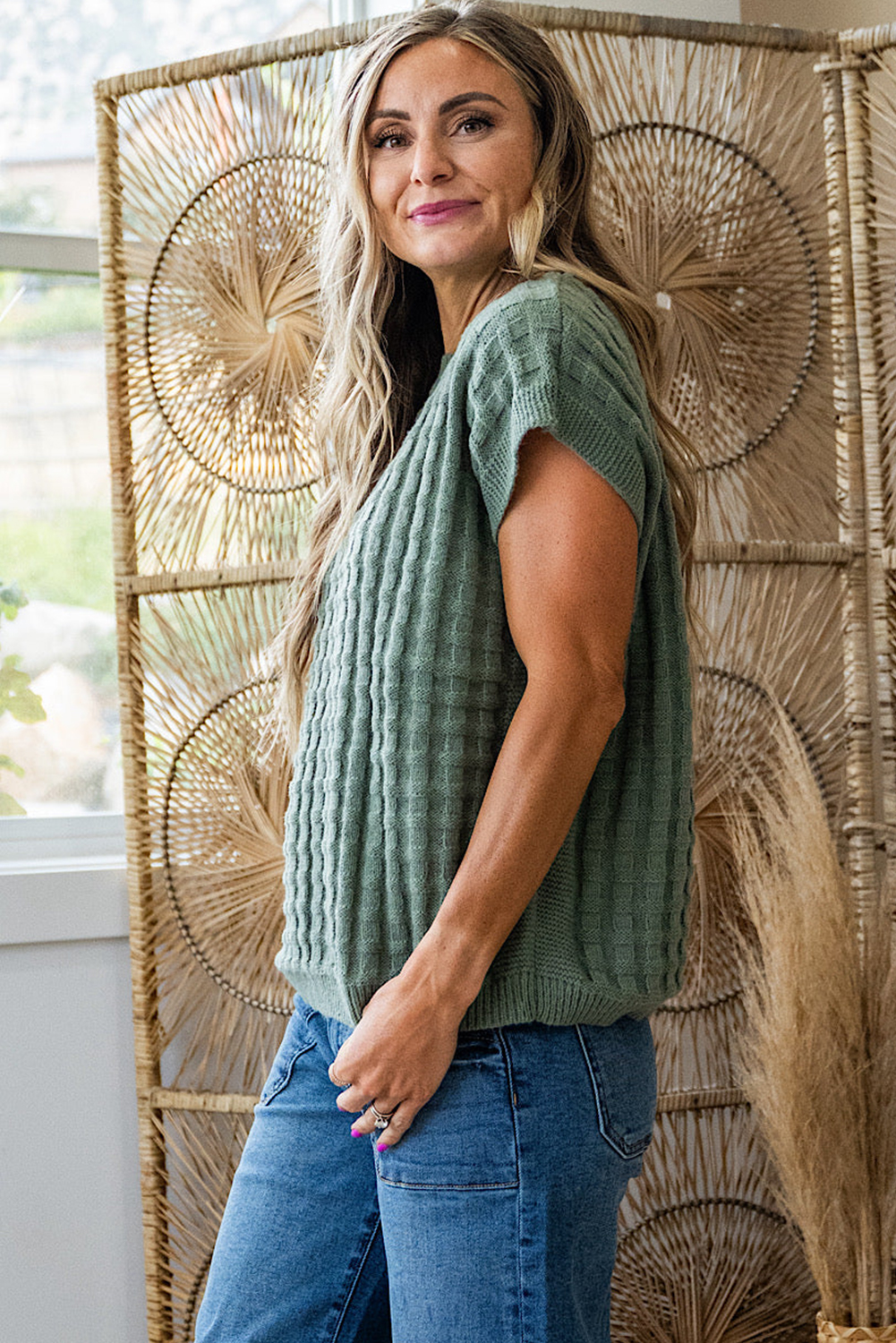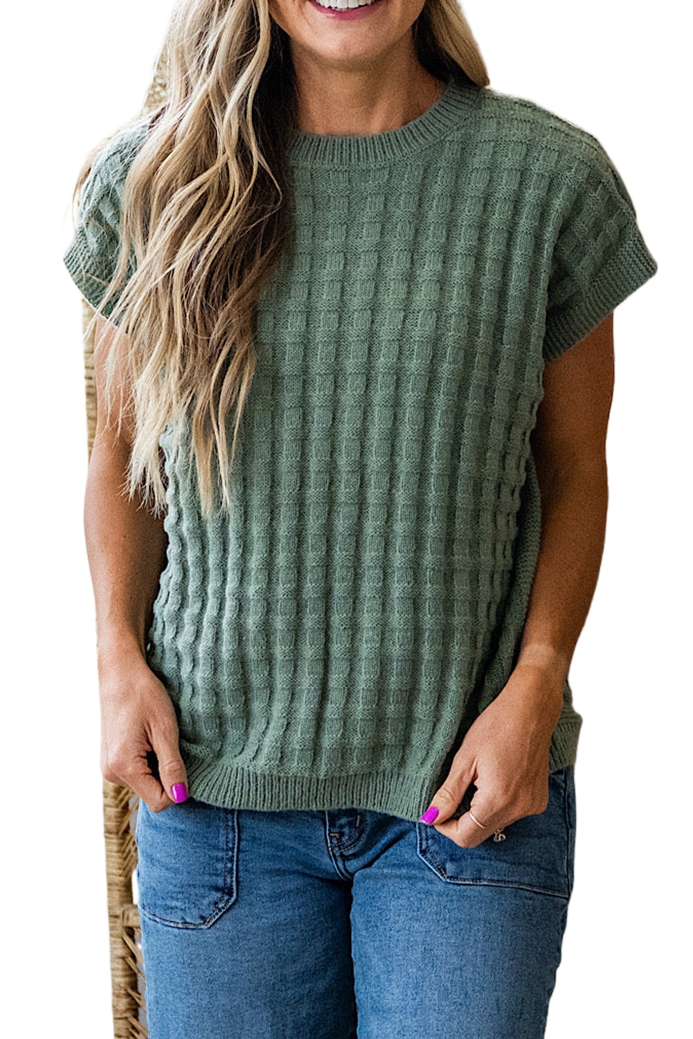 Women’s Mist Green Textured Short Sleeve Sweater – Casual Summer Essential