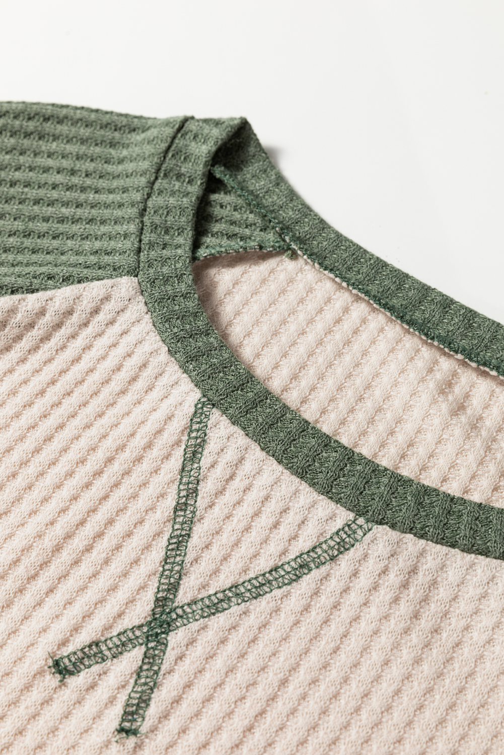 1. Trendy Color Block Design: The Mist Green Waffle Color Block Raglan Sleeve Top features a stylish color block pattern that adds a modern twist to your casual wardrobe, making it a standout piece for any occasion.