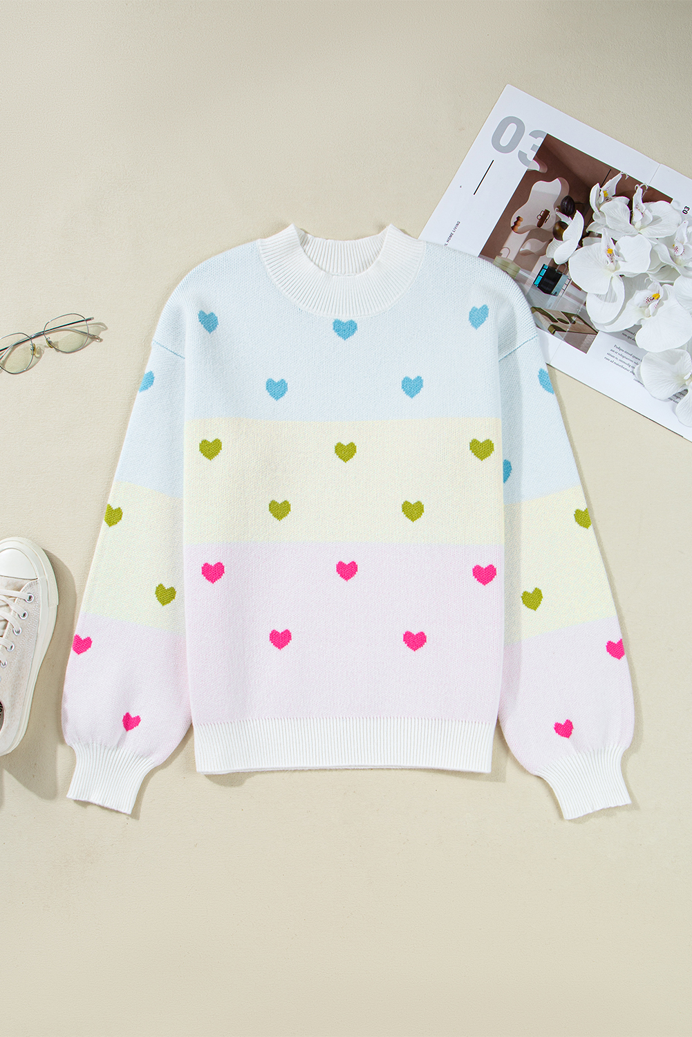 Women’s Multicolour Heart Pattern Colorblock Knit Sweater – Cozy High Neck Baggy Style for Daily Wear
