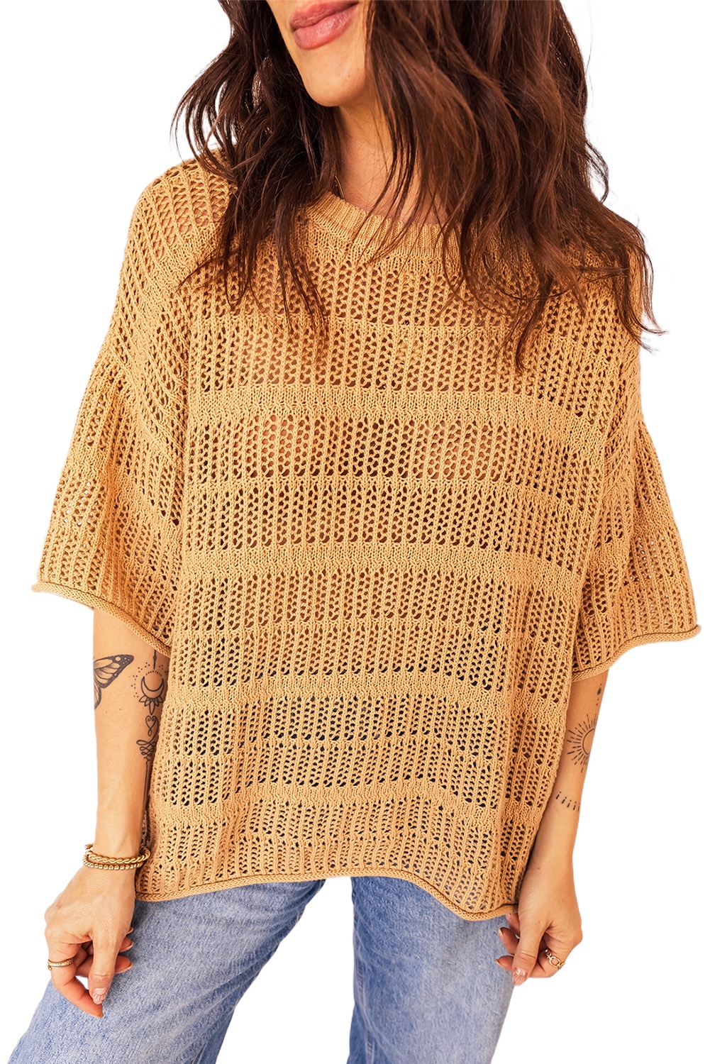 Women's Mustard Openwork Knit Sweater – Casual 3/4 Sleeve for Stylish Spring DaysWomen’s Mustard Openwork Knit Sweater – Casual 3/4 Sleeve for Stylish Spring Days