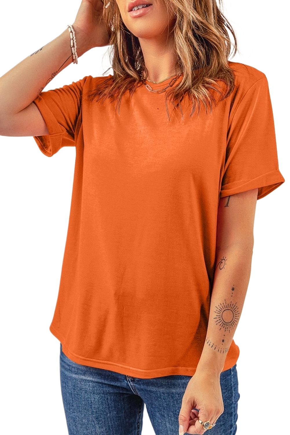 1. Bright and Bold Style: The Orange Casual Plain Crew Neck Tee adds a vibrant pop of color to your wardrobe, perfect for making a statement during the summer months.