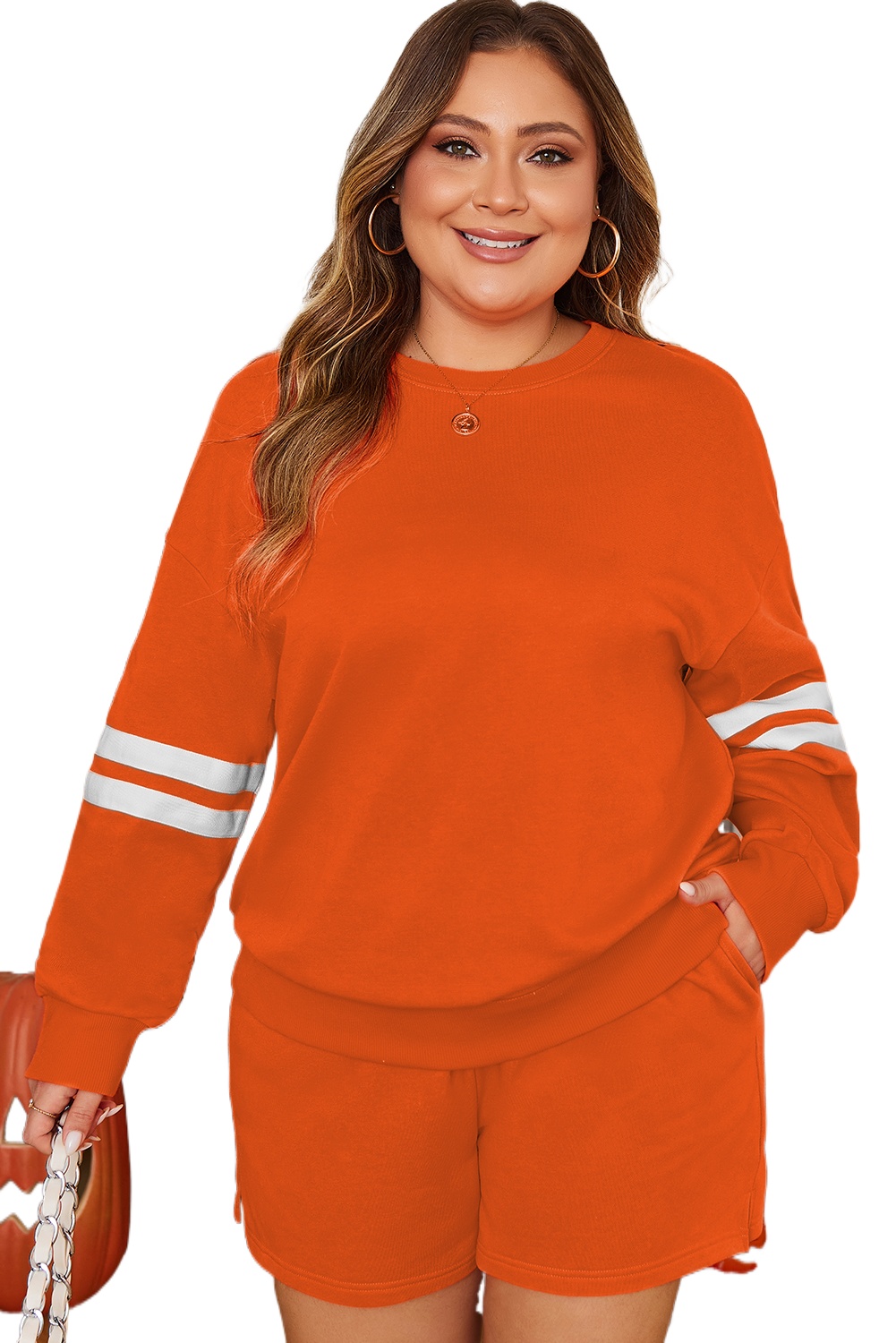 Women’s Orange Plus Size Varsity Striped Drop Shoulder Pullover Short Set for Daily Casual Wear