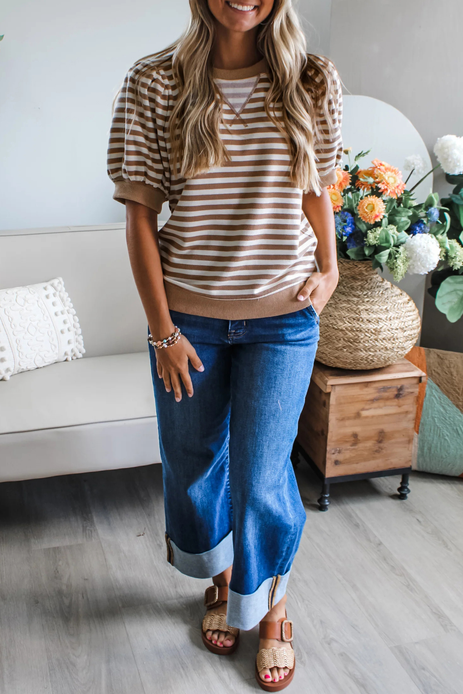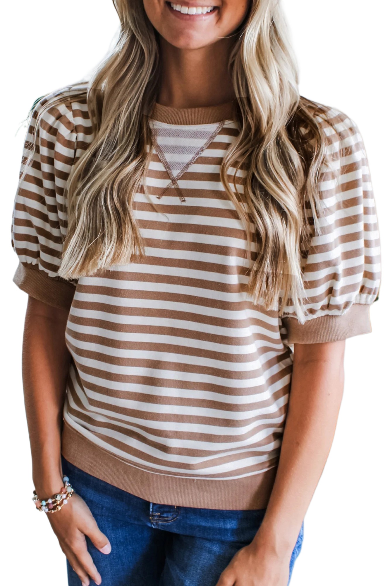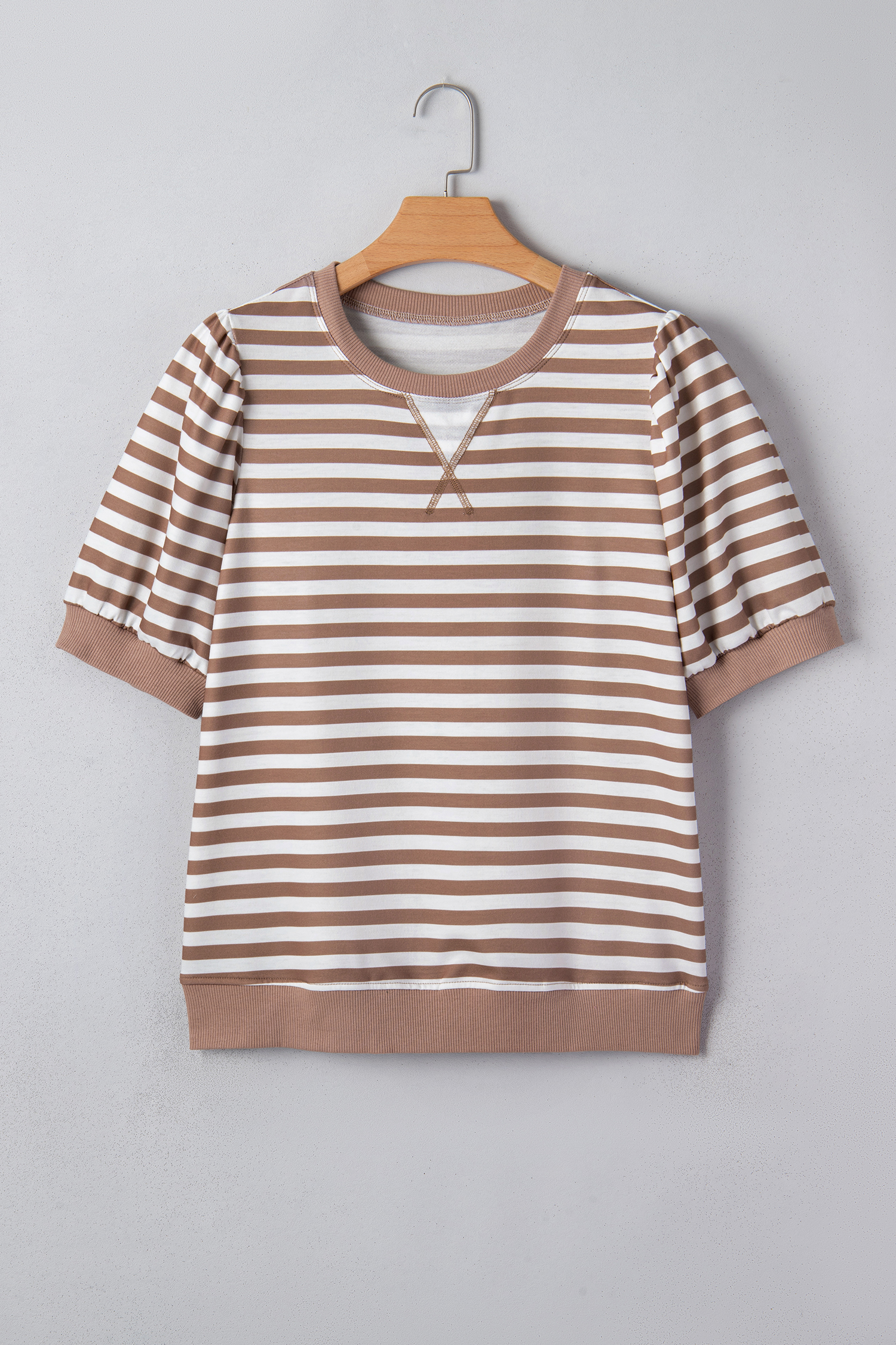 Women’s Orange Stripe Short Bubble Sleeve T-Shirt – Casual Summer Style for Everyday Wear