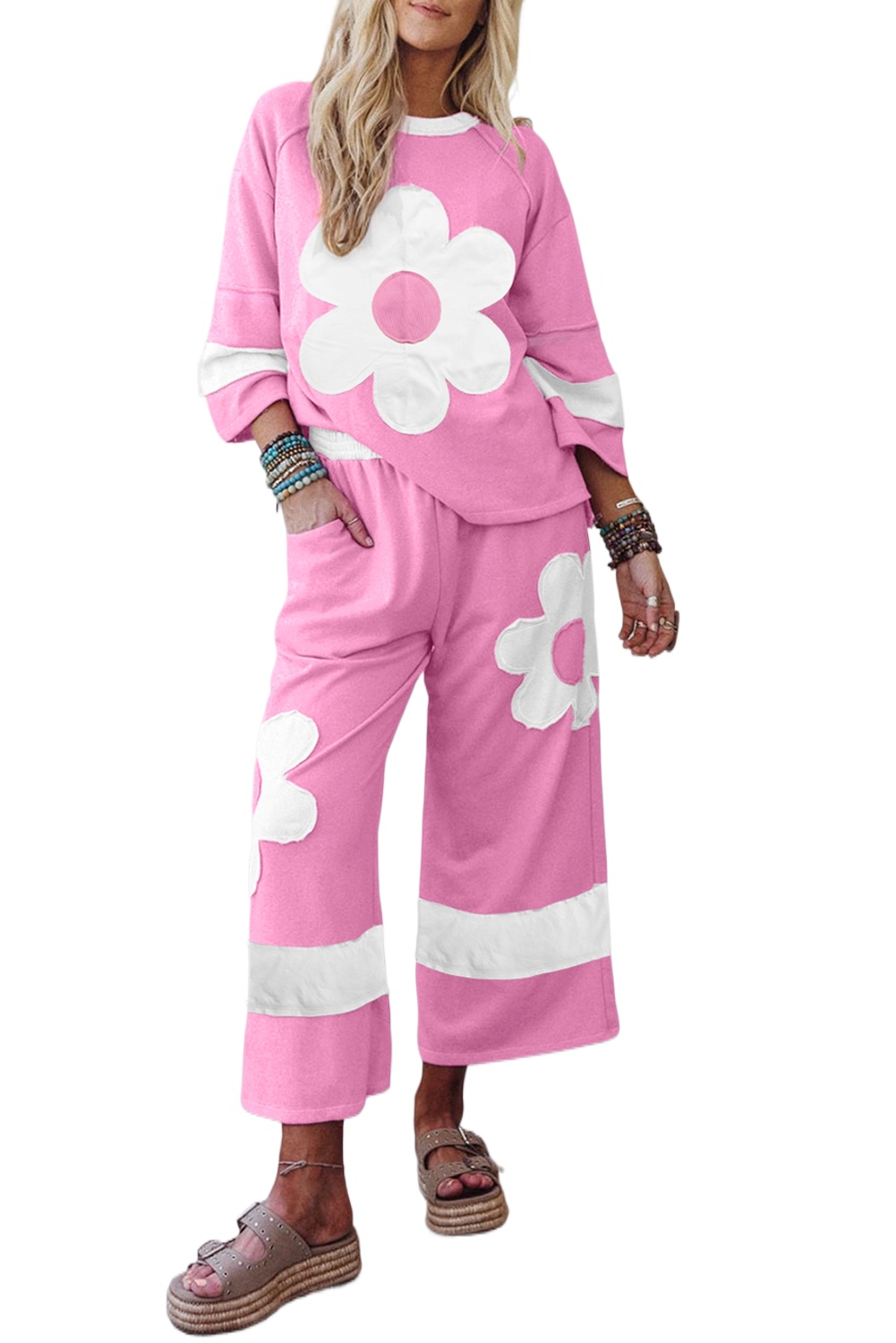 Women’s Orchid Bouquet Color Block 2-Piece Loose Pant Set – Casual Fall Outfit for Daily Wear