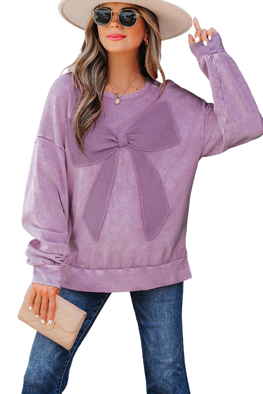 Women’s Orchid Bouquet Mineral Wash Pullover – Cozy Big Bow Patchwork Sweatshirt for Daily Style
