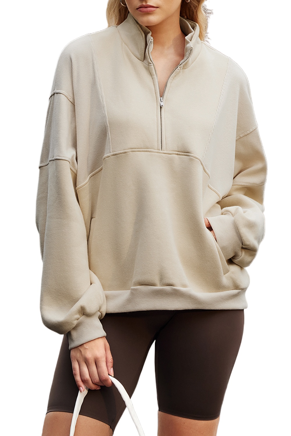 Women’s Oversized Apricot Half Zip Sweatshirt – Casual Long Sleeve Daily Wear