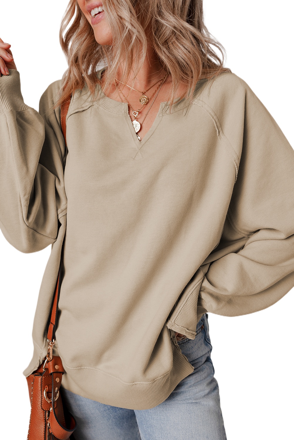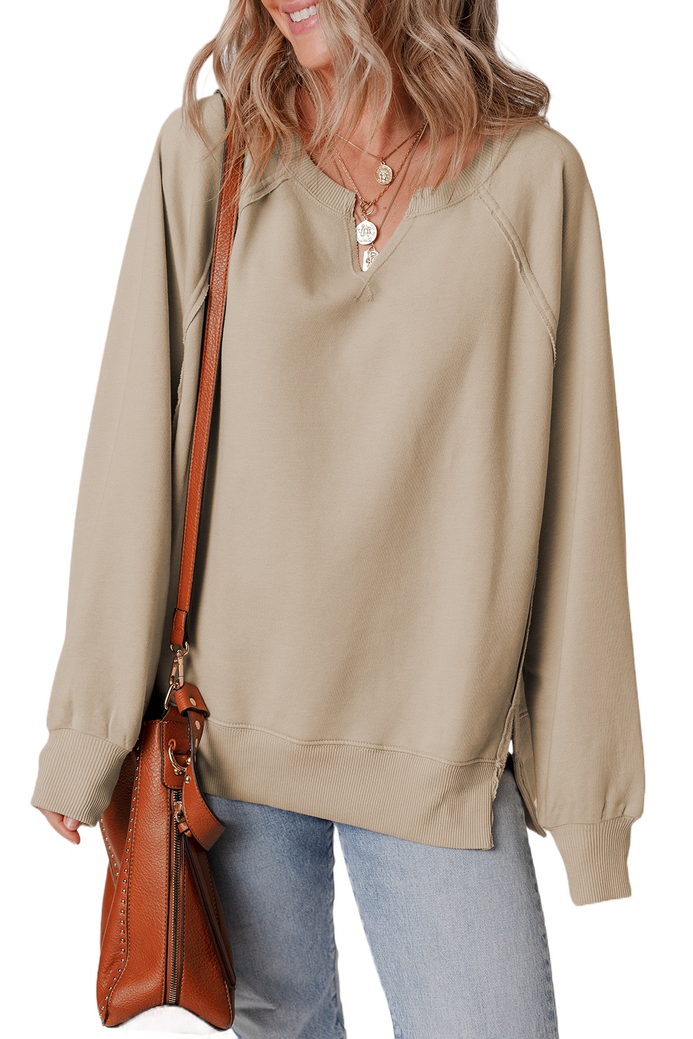 Women’s Parchment Raw Edge Exposed Seam Raglan Sleeve Sweatshirt with Side Slit