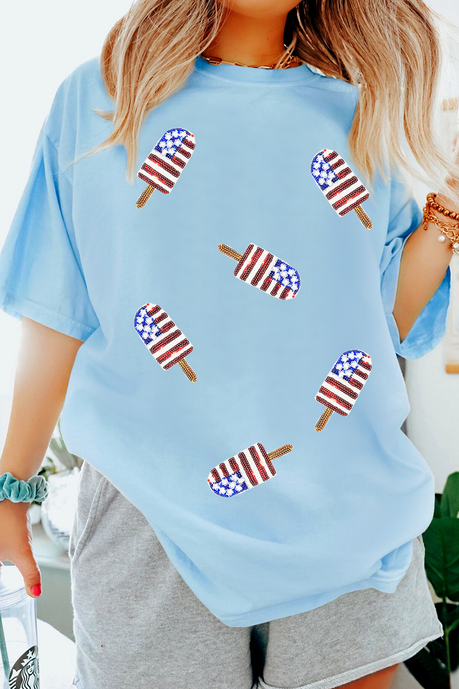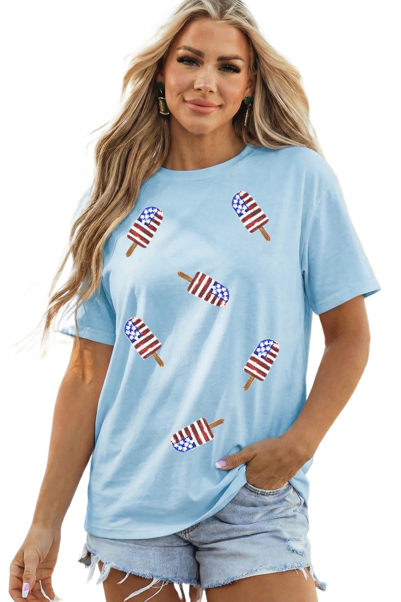 Women’s Patriotic Sequin Popsicle T-Shirt – Light Blue Round Neck Short Sleeve Tee for Summer