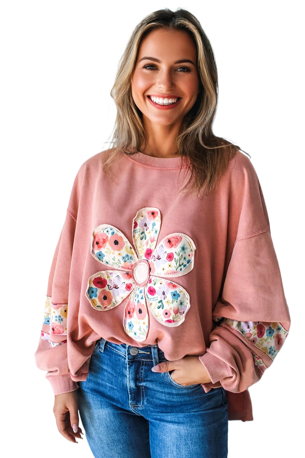 Women’s Peach Blossom Floral Applique Pullover – Cozy Casual Sweatshirt for Everyday Wear